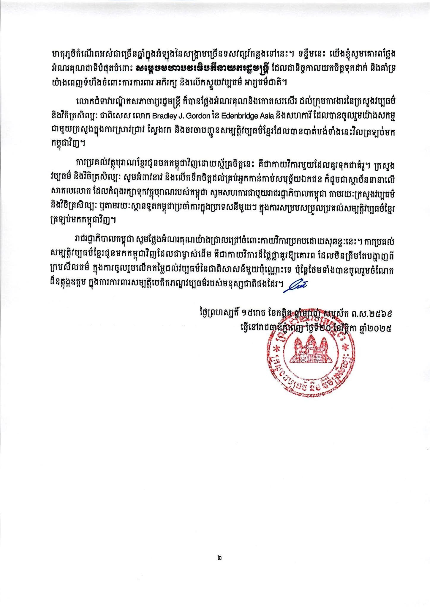 ក្នុងនោះ ក្រសួងវប្បធម៌ ក៏បានថ្លែងអំណរគុណ និង វាយតម្លៃខ្ពស់ ចំពោះការសម្រេចចិត្តដ៏ត្រឹមត្រូវរបស់ លោក Zelnik ដែលបច្ចុប្បន្នលោកមានអាយុជាង ៧០ ឆ្នាំហើយ ក្នុងការប្រគល់វត្ថុសិល្បៈខ្មែរទាំងអស់ជូនមកកម្ពុជាវិញ។ នាពេលកន្លងមក លោក Zelnik ក៏ធ្លាប់បានប្រគល់វត្ថុសិល្បៈខ្មែរមួយចំនួនជូនមកកម្ពុជាវិញ និងបានចូលរួមវិភាគទាន ដ៏សំខាន់ក្នុងគម្រោងស្រាវជ្រាវបុរាណវិទ្យា និង ការបោះពុម្ពស្នាដៃស្រាវជ្រាវវិទ្យាសាស្ត្រជាច្រើនផងដែរ ពាក់ព័ន្ធនឹងបេតិកភណ្ឌវប្បធម៌ សិលាចារឹក និង សិល្បៈខ្មែរសម័យទំនើប៕