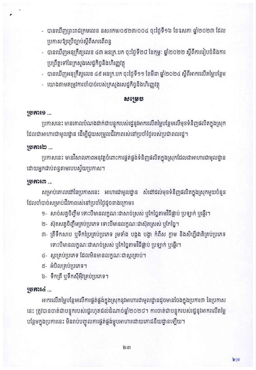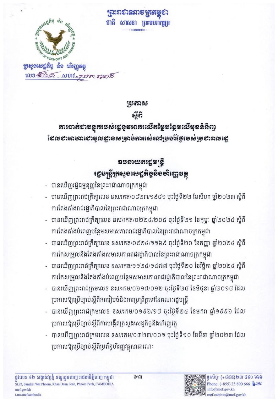 នៅថ្ងៃទី ០១ ខែធ្នូ ឆ្នាំ ២០២៥ នេះ ក្រសួងសេដ្ឋកិច្ច និង ហិរញ្ញវត្ថុ បានចេញសេចក្ដីប្រកាសមួយ ស្ដីពី ការចាត់ជាបន្ទុករបស់រដ្ឋនូវអាករលើតម្លៃបន្ថែមលើមុខទំនិញដែលជាអាហារជាមូលដ្ឋានសម្រាប់ជួយសម្រួលដល់ជីវភាពការរស់នៅប្រចាំថ្ងៃរបស់ប្រជាពលរដ្ឋ។