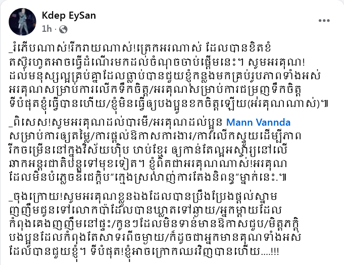 ចុងក្រោយ! សូមអរគុណខ្លួនឯង ដែលបានប្រឹងប្រែងផ្ដល់ស្នាមញញឹម ជូនទៅលោកប៉ា ដែលបានឃ្លាតទៅឆ្ងាយ, អ្នកម្ដាយ ដែលកំពុងគេងញញឹមនៅផ្ទះ, កូនៗ ដែលមិនទាន់មានឱកាសជួប, មិត្តភក្តិ បងប្អូន ដែលកំពុងតែសាទរពីចម្ងាយ ក៏ដូចជាអ្នកមានគុណទាំងអស់ដែលបានជួយខ្ញុំ។ ទីបំផុត! ខ្ញុំអាចក្រោកឈរវិញបានហើយ»៕