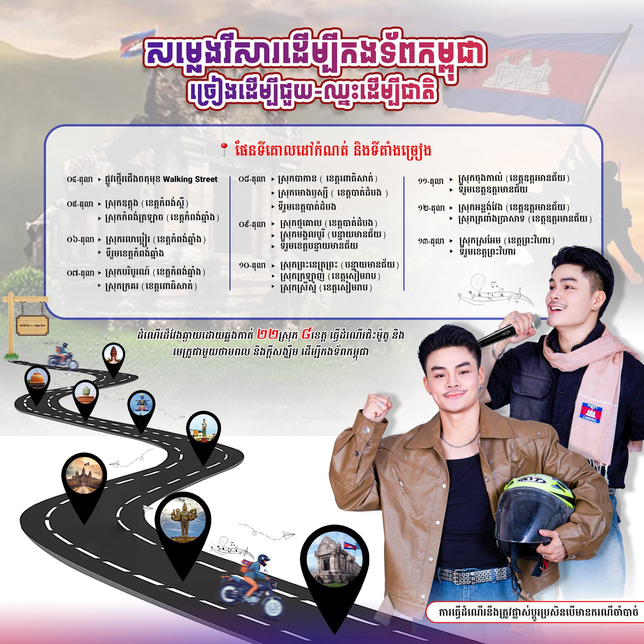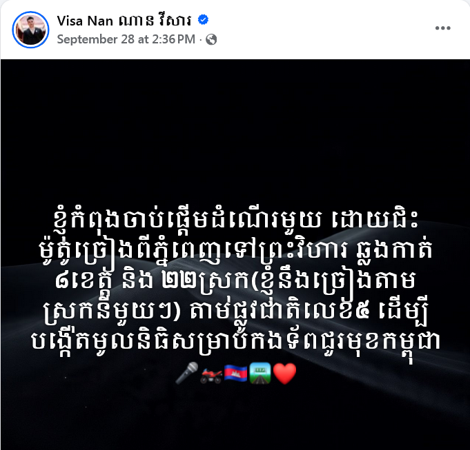 គួរជម្រាបថា ដំណើរនៃការជិះម៉ូតូច្រៀងរបស់លោក ណាន វីសារ ពីភ្នំពេញ ឆ្ពោះទៅកាន់ខេត្តព្រះវិហារ នឹងចាប់ផ្តើមពីថ្ងៃទី ០៤ ខែតុលា ឆ្នាំ ២០២៥ រហូតដល់ថ្ងៃទី ១៣ ខែតុលា ឆ្នាំ ២០២៥ ខាងមុខនេះ។ នេះបើតាមកាលវិភាគលោក ណាន វីសារ បានបង្ហោះឡើងលើផេកផ្លូវការរបស់លោក៕