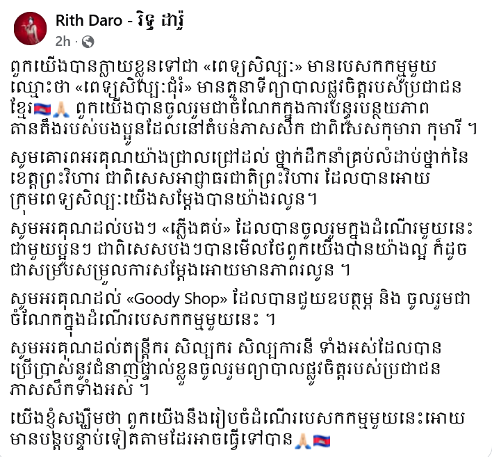 យ៉ាងណាមិញ ក្នុងការសម្តែងតាមជំរំភៀសសឹកនេះដែរ ក្នុងនាមជាសិល្បករមួយរូប តួត្លុក រិទ្ធ ដារ៉ូ ហៅព្រះនាងតូច បានបង្ហាញអារម្មណ៍ក្តុកក្តួលថា ខ្លួនធ្លាប់តែឮចាស់ៗតំណាលប្រាប់ តែពេលនេះបានជួនស្ថានភាពដោយខ្លួនឯងហើយ ដោយលោក និង ក្រុមសិល្បៈបានទៅសម្តែងនៅជំរំជាបន្តបន្ទាប់៕