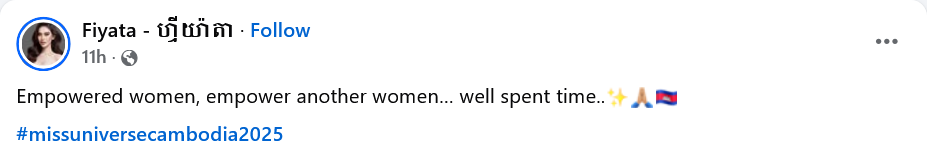 ក្រោយពីការវិលត្រឡប់ពីការប្រកួតកម្មវិធី Miss Universe លើកទី ៧៤ វិញហើយនោះ អ្នកនាង ហ្វីយ៉ាតា Miss Universe Cambodia 2025 កាន់តែទទួលបានការចាប់អារម្មណ៍យ៉ាងខ្លាំងពីសំណាក់អ្នកគាំទ្រ បន្ទាប់ពីបវរកញ្ញាកម្ពុជារូបនេះ បានកាន់ទង់ជាតិកម្ពុជា និង ស្រែកឈ្មោះកម្ពុជាយ៉ាងខ្លាំងៗលើឆាកអន្តរជាតិនៅប្រទេសថៃកន្លងមក។