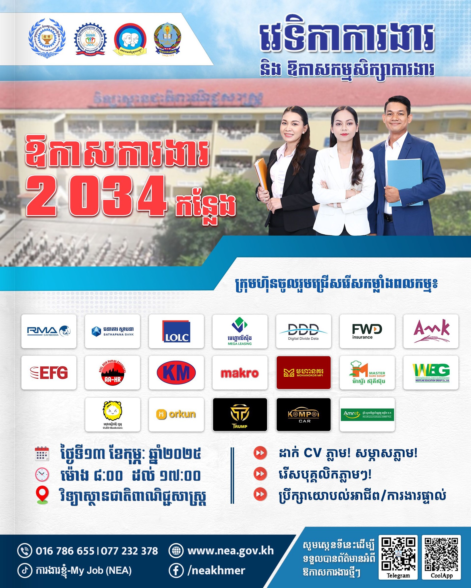 ជាឱកាសដ៏ល្អសម្រាប់អ្នកដែលកំពុងចង់ស្វែងរកការងារ នៅថ្ងៃទី ០៥ ខែកុម្ភៈ ឆ្នាំ ២០២៥ ថ្មីៗនេះ ទីភ្នាក់ងារជាតិមុខរបរ និង ការងារ បានជូនដំណឹងឱ្យបានដឹងថា ខាងទីភ្នាក់ងារ និង វិទ្យាស្ថានជាតិពាណិជ្ជសាស្ត្រ បានសហការគ្នារៀបចំវេទិកាការងារ ដោយនាំយកឱកាសការងារថ្មីបន្ថែមទៀតចំនួន ២០៣៤ កន្លែង ពីក្រុមហ៊ុនធំៗចំនួន ១៩ ។
