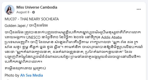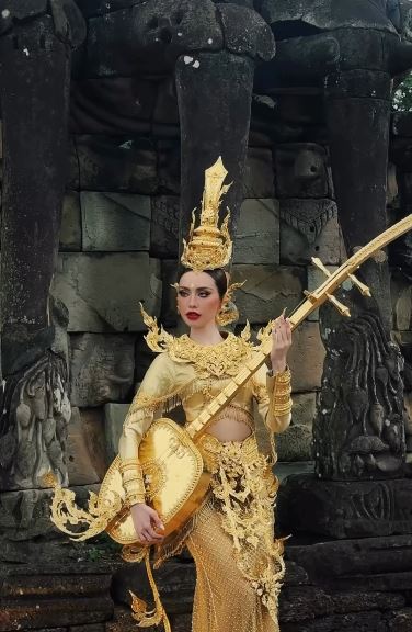 យ៉ាងណាមិញ ក្រឡេកមកមើលជុំវិញអត្ថន័យ ក៏ដូចជាប្រភពនៃការច្នៃម៉ូតឈុតតំណាងជាតិកម្ពុជាដ៏ប្រណីតល្អឯកនេះ គឺមានអន្ថន័យថា ៖ «Golden Japei / ចាប៉ីដងវែង: ចាប៉ីដងវែង ត្រូវបានដាក់បញ្ចូលជាសម្បត្តិបេតិកភណ្ឌវប្បធម៌អរូបីមនុស្សជាតិពិភពលោក ដោយអង្គការ UNESCO នាថ្ងៃទី៣០ ខែវិច្ឆិកា ២០១៦ នៅទីក្រុង Addis Ababa ប្រទេសអេត្យូពី។ ចាប៉ី ដែលមានសំឡេងពីរោះ គឺធ្វើតាមពាក្យពោលថា “ស្នូក រាំង ដង ក្រសាំង សន្ទះ ខ្ទុម្ព គីង្គក់ ធ្នង់ ខ្ទង់ ឆ្អឹង”។ តាមគំនិត ចាស់បុរាណបានឱ្យនិមិត្ដរូបលើឧបករណ៍នេះថា “ស្នូកតំណាងក្បាលនាគ, ដងតំណាងខ្លួននាគ, ប្រពែតំណាងកន្ទុយនាគ” ដែលបង្ហាញពីតម្លៃនៃវប្បធម៌ដ៏ចំណាស់របស់ខ្មែរ ព្រមទាំងជាតួអង្គមួយដ៏លេចធ្លោនៅលើវេទិកាបេតិកភណ្ឌពិភពលោក។ ដំឡើងឈុតដោយ ស្ករគ្រាប់»៕