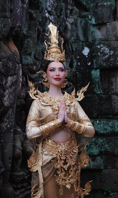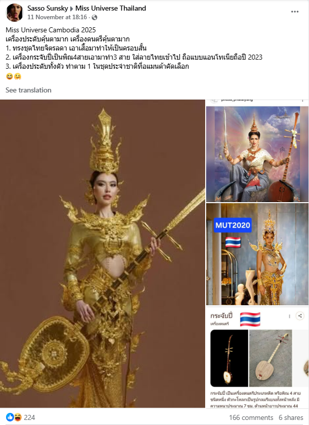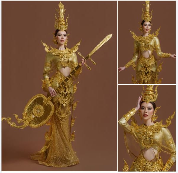 ស្របពេលបណ្ដាញសង្គមកម្ពុជាកំពុងចែករំលែកពីឈុតតំណាងជាតិដ៏ប្រណីតនេះដែរ ក៏បានឃើញខាងបណ្ដាហ្វេសប៊ុកផេករបស់ថៃជាច្រើន បានចែករំលែកពីឈុតតំណាងជាតិកម្ពុជាទៅប្រៀបធៀបនឹងឈុតរបស់ថៃ ដែលបានលើកឡើងថាឈុត និង គ្រឿងប្រដាប់របស់កម្ពុជា គឺរចនាយកលំនាំពីឈុតថៃទៀតផង។ ក្នុងនោះ ហ្វេសប៊ុកថៃទាំងនោះ បានលើកនិយាយពីការច្នៃរចនាម៉ូតឈុត ក៏ដូចជាគ្រឿងអលង្ការរបស់ខ្មែរ ថាយកម៉ូតតាមឈុតរបស់ថៃឈ្មោះ Chitlada និង បវរកញ្ញា Amanda ព្រមទាំងឧបករណ៍ភ្លេងចាប៉ីដងវែង ក៏ធ្វើឡើងតាមលំនាំថៃដូចបវរកញ្ញា Antonia កាន់កាលពីឆ្នាំ ២០២៣។