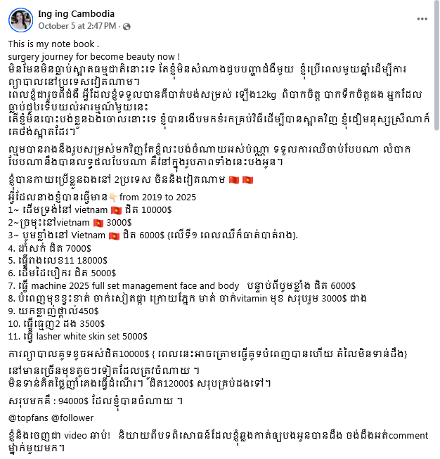 ជាក់ស្តែង បន្ទាប់ពីរូបសម្រស់ខុសប្លែងដល់ទៅ ១៨០ ដឺក្រេ ថ្មីៗនេះ ស្រីស្អាត អ៊ីងអ៊ីង ក៏មិនលាក់លៀមនោះដែរ ដោយនាងបានឱ្យដឹងថា តាំងពីឆ្នាំ ២០១៩ រហូតដល់ឆ្នាំ ២០២៥ ពោលគឺរយៈពេល ៦ ឆ្នាំ នាងបានកែកុនតាំងពីចុងសក់ ដល់ចុងជើង ដោយចាយលុយអស់ជិត ១០ ម៉ឺន ដុល្លារ។ ម្យ៉ាងវិញទៀត ភាគច្រើននាងបានហោះហើរទៅវះកាត់នៅឯប្រទេសចិន និង វៀតណាម៕