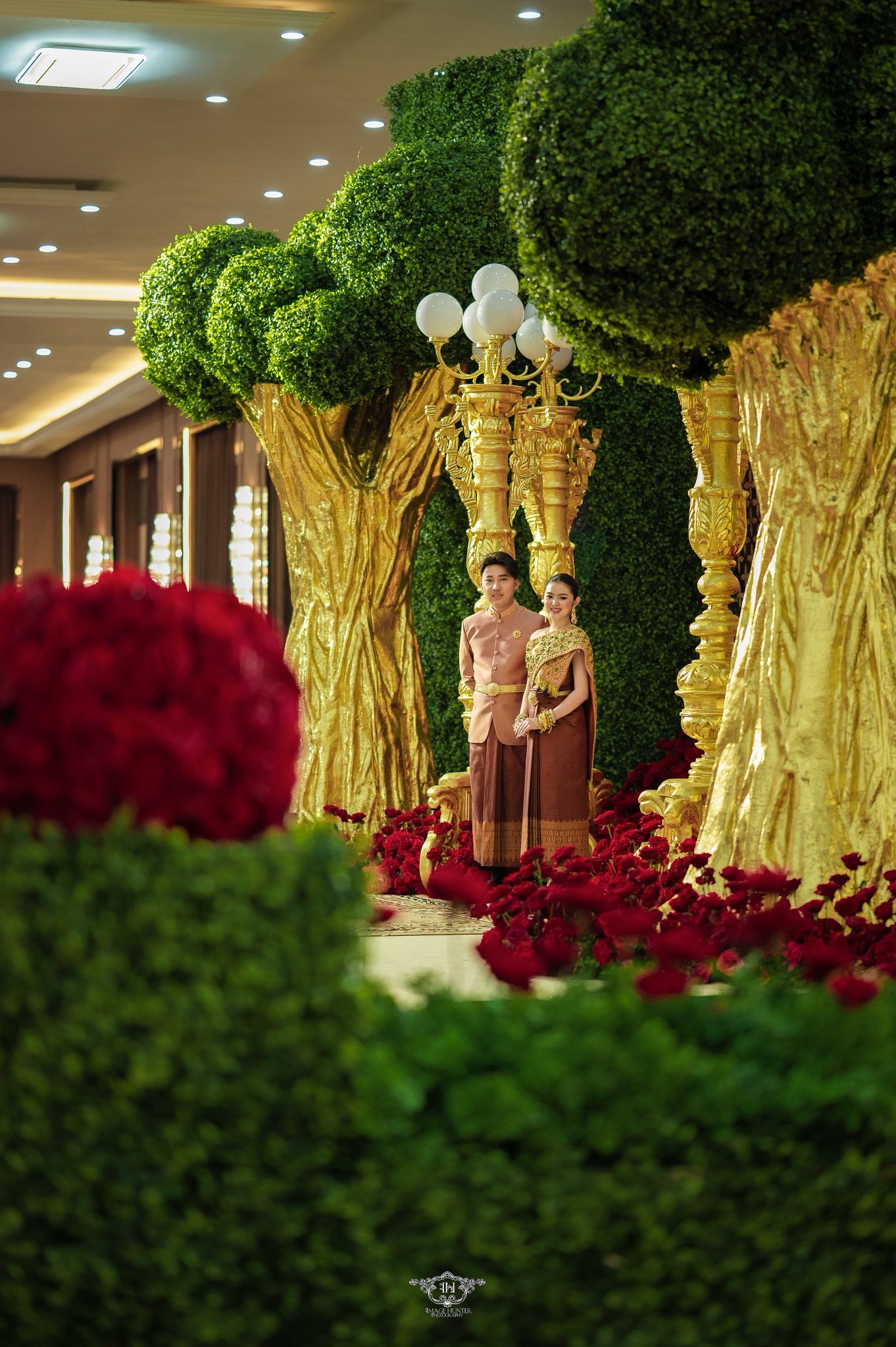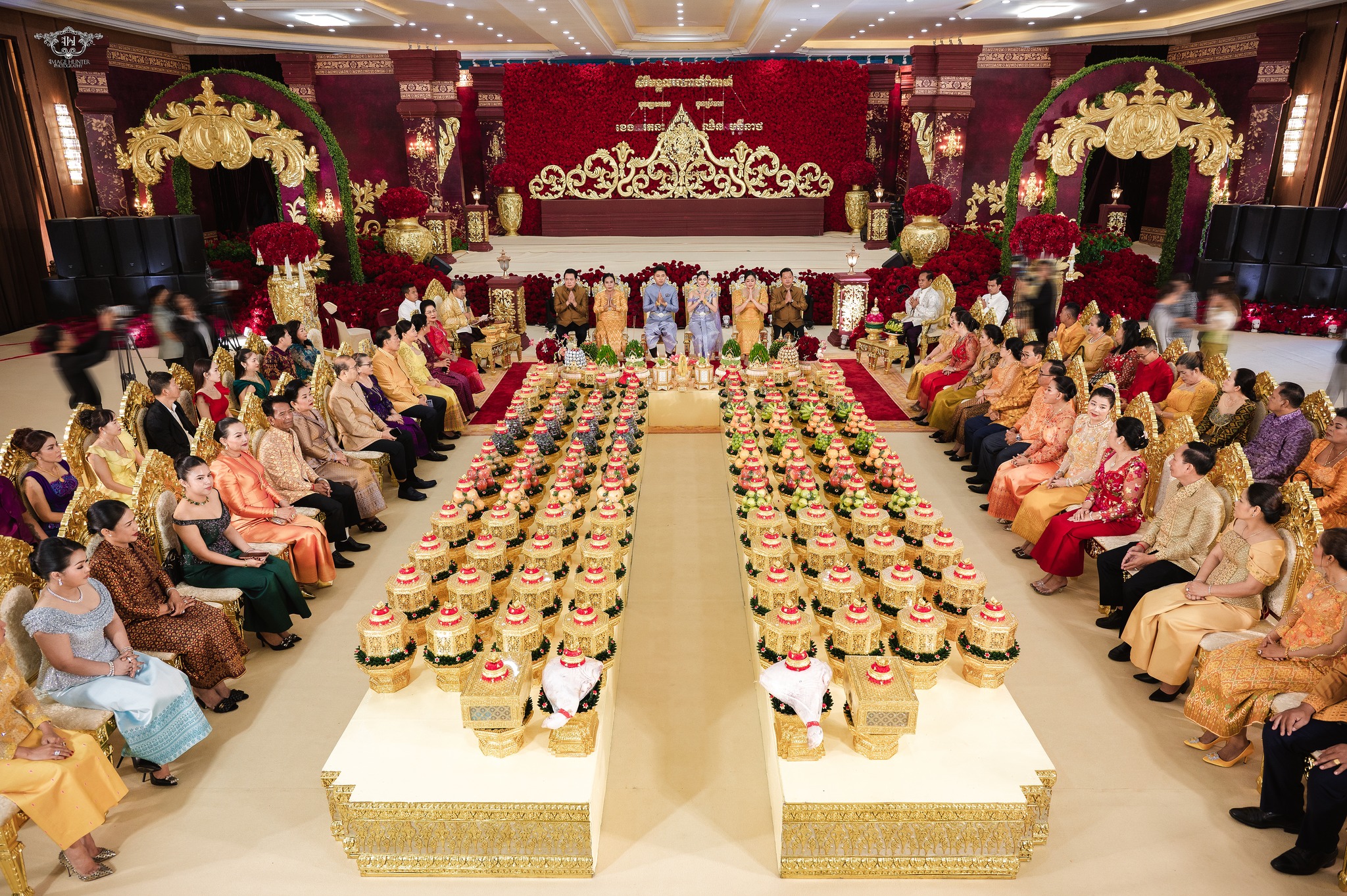 បើក្រឡេកទៅមើលទិដ្ឋភាពនាពេលល្ងាច ជាកម្មវិធីជប់លៀងនៃថ្ងៃមង្គលនេះដែរ ឃើញថាមានការរៀបចំឡើងយ៉ាងប្រណីត និង ត្រជាក់ភ្នែកខ្លាំងនៃបរិវេណរោងការទាំងមូល អមរចនាដោយក្បាច់ខ្មែរ និង ផ្កាស្រស់ពណ៌ក្រហមក្រម៉ៅយ៉ាងស្រស់ស្អាតមានលេចធ្លោខ្លាំង។