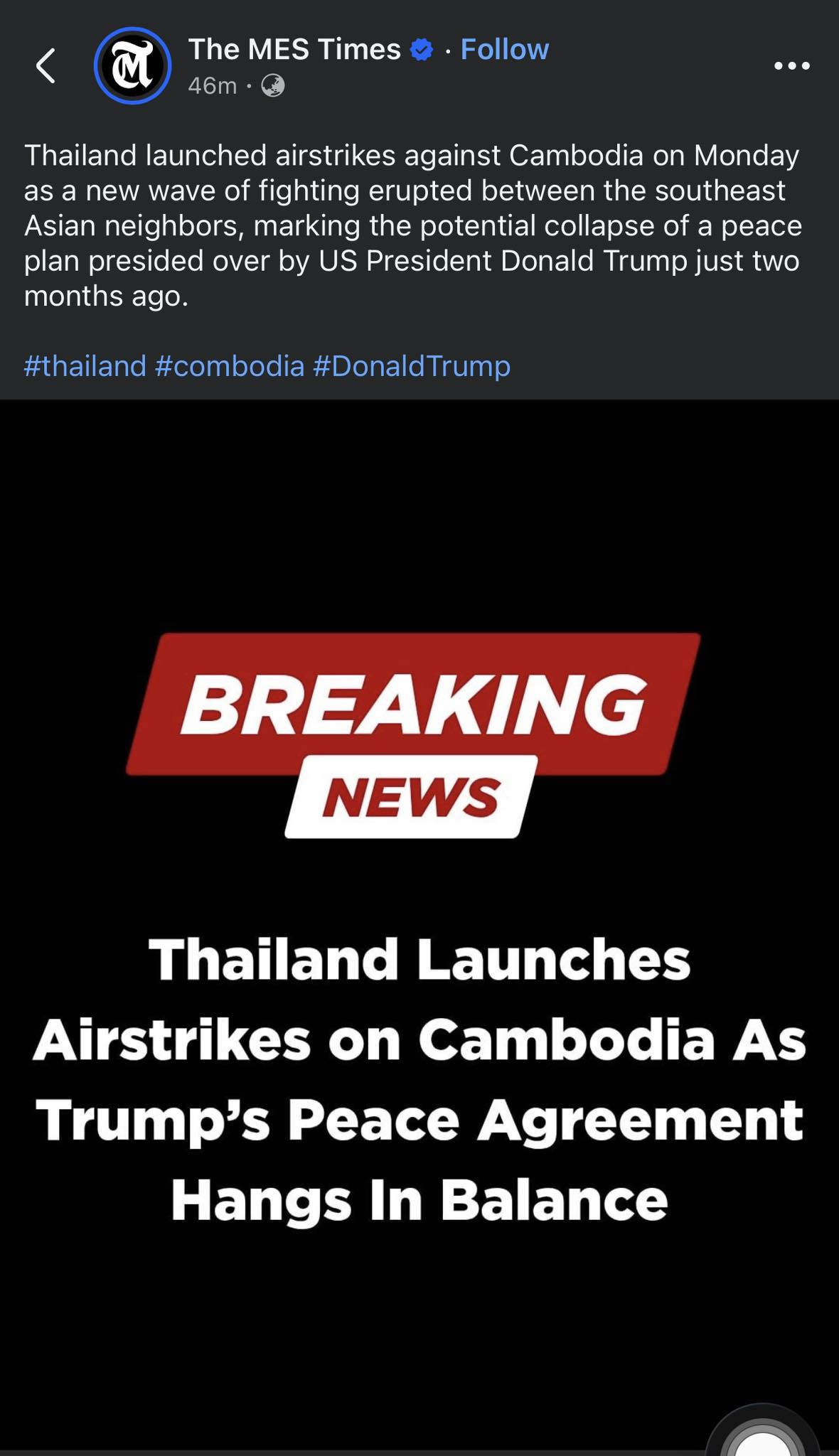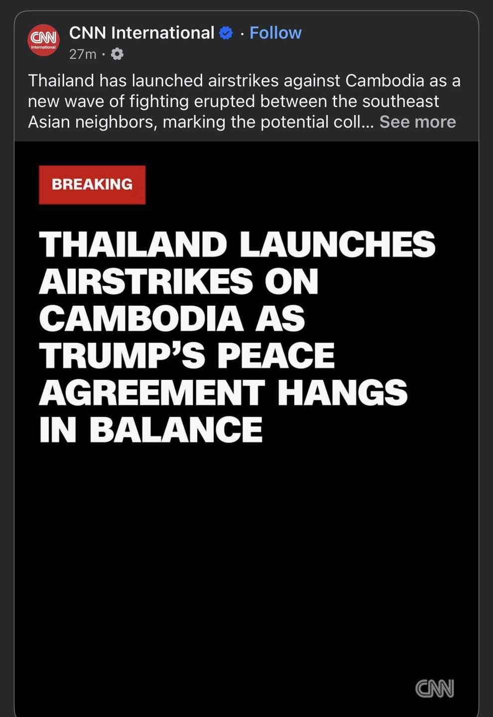 នៅព្រឹកថ្ងៃទី ០៨ ខែធ្នូ ឆ្នាំ ២០២៥ នេះ សារព័ត៌មានអន្តរជាតិធំៗជាច្រើន បានចេញផ្សាយឱ្យបានដឹងថា ៖ «ប្រទេសថៃ បានចាប់ផ្តើមការវាយប្រហារតាមផ្លូវអាកាសមកលើកម្ពុជា នៅថ្ងៃចន្ទ ខណៈដែលរលកថ្មីនៃការប្រយុទ្ធគ្នា បានផ្ទុះឡើងរវាងប្រទេសជិតខាងអាស៊ីអាគ្នេយ៍ ដែលបង្ហាញពីសក្តានុពលនៃការដួលរលំនៃផែនការសន្តិភាព ក្រោមអធិបតីភាពប្រធានាធិបតីសហរដ្ឋអាមេរិកលោក Donald Trump កាលពីពីរខែមុន»។