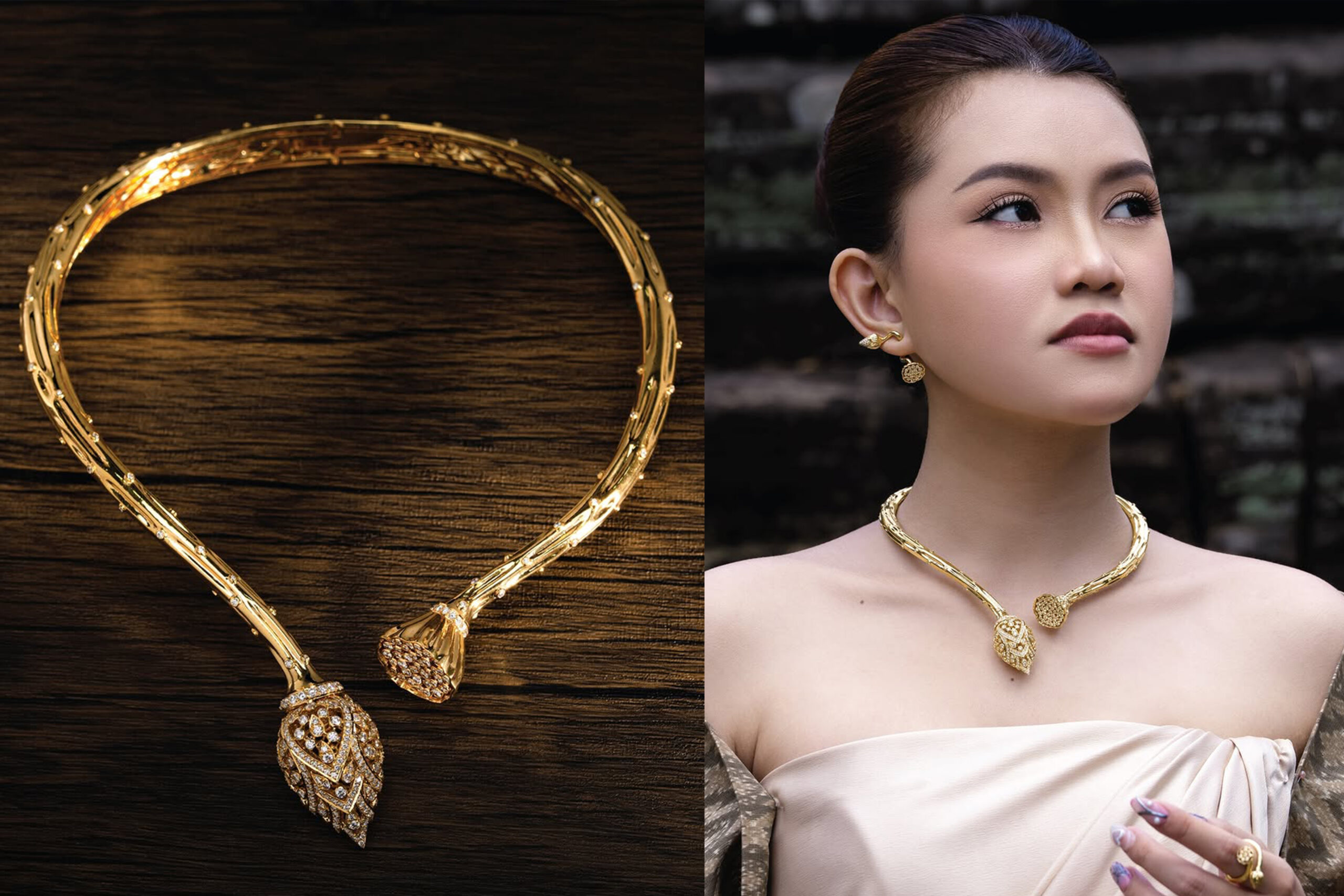ជាក់ស្តែង ដូចថ្មីថ្មោងនេះ ម៉ាកគ្រឿងអលង្ការដ៏ល្បីនៅកម្ពុជា CBVS បានដកស្រង់សម្រស់ផ្កាឈូកមកបង្កើតជាគ្រឿងអលង្ការ មានជាឈុត ដូចជាក្រវិល ខ្សែក ចិញ្ចៀន និង តង្កៀបសក់ជាដើម។