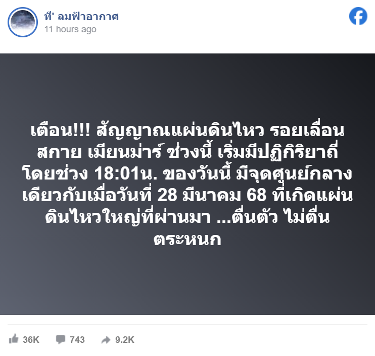 ថ្មីៗនេះ មានផេកល្បីមួយនៅថៃ បានទម្លាយពីការរញ្ជួយដីជាច្រើនដងនៅប្រទេសមីយ៉ាន់ម៉ា ដែលចំចំណុចដើមកាលពីខែមីនា ឆ្នាំ ២០២៥ កន្លងទៅ បង្កឱ្យប្រជាជនថៃមានការភ័យព្រួយ ខ្លាចនឹងមានការរញ្ជួយឆ្លងមកដល់ខ្លួនម្តងទៀត។