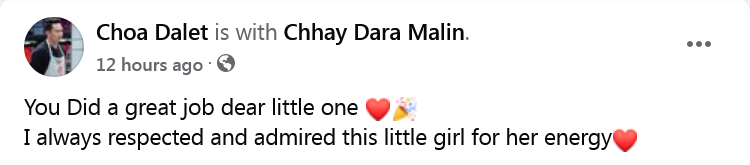 ងាកមកបុរសមុខស្មើ លោក ចៅ ដាឡែត វិញ ក៏បានបង្ហោះសារផ្ញើជូនទៅដល់កញ្ញា ម៉ាលីន ធ្វើឱ្យអ្នកគាំទ្រឃើញហើយញញឹមមិនមាត់មិនជិតនោះឡើយ។ សារនោះ លោក ដាឡែត រៀបរាប់ថា៖ «You Did a great job dear little one. I always respected and admired this little girl for her energy» ដែលមានអត្ថន័យថា៖ «អ្នកធ្វើបានល្អហើយ ក្មេងតូច! ខ្ញុំតែងតែគោរព និង កោតសរសើរក្មេងស្រីតូចម្នាក់នេះ ចំពោះថាមពលរបស់នាង»។