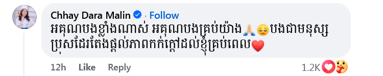 ភ្លាមនោះមិនបង្អង់ កញ្ញា ម៉ាលីន ក៏បានចូលទៅខមមិនឆ្លើយតបទៅកាន់លោក ដាឡែត ភ្លាមៗថា៖ «អរគុណបងខ្លាំងណាស់ អរគុណបងគ្រប់យ៉ាង! បងជាមនុស្សប្រុស ដែលតែងផ្តល់ភាពកក់ក្តៅដល់ខ្ញុំគ្រប់ពេល»៕