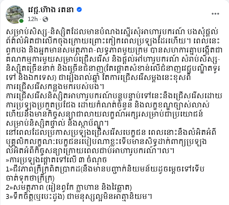 ក្នុងនោះ វេជ្ជ. ហ៊ាង រតនា បានបញ្ជាក់ថា៖ «សម្រាប់សិស្ស-និស្សិតដែលមានបំណងស្នើសុំអាហារូបករណ៍ បងសុំផ្តល់ព័ត៌លម្អិតជាលើកចុងក្រោយ ព្រោះកៀកពេលប្រឡងដែរហើយ។ ពេលនេះពួកបង និង អ្នកមានសមត្ថភាព-លទ្ធភាពមួយក្រុម បានសហការគ្នាបង្កើតជាគណៈកម្មការមួយសម្រាប់ជ្រើសរើស និង ផ្តល់អាហារូបករណ៍ សម្រាប់សិស្ស-និស្សិតច្រើននាក់ និង ច្រើនជំនាញ (តែផ្តោតសំខាន់លើជំនាញវេជ្ជបណ្ឌិតទូទៅ និង ឯកទេស) ជារៀងរាល់ឆ្នាំ តែការជ្រើសរើសម្តងនេះខុសពីការជ្រើសរើសកន្លងមករបស់បង។