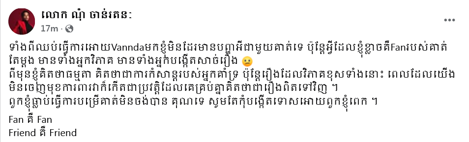 នៅរសៀលថ្ងៃទី ១៣ ខែតុលា ឆ្នាំ ២០២៥ អ្នកគាំទ្រ លោក ណុំ ចាន់រតនៈ ហៅ សង្ហា បាន និង កំពុងចាប់អារម្មណ៍នឹងសំណេរមួយរបស់លោក ដែលរៀបរាប់ពីទំនាក់ទំនងជាមួយនឹងតារាចម្រៀងរ៉េប វណ្ណដា ក្រោយពីអ្នកទាំង ២ ឈប់ធ្វើការជាមួយគ្នាមួយរយៈធំមក។