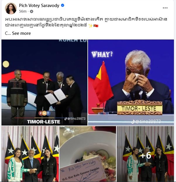 ក្នុងនោះ ពេជ្រ វត្តីសារ៉ាវឌ្ឍី បានរៀបរាប់ភ្ជាប់ជាមួយរូបភាពថា ៖ «អបអរសាទរសាធារណរដ្ឋប្រជាធិបតេយ្យទីម័រខាងកើត ក្លាយជាសមាជិកទី១១ របស់អាស៊ានយ៉ាងពេញលេញនៅថ្ងៃទី ២៦ ខែតុលា ឆ្នាំ២០២៥ Congratulations to Timor-Leste on officially becoming the 11th member of ASEAN this 26 October 2025. May the friendship and cooperation among all ASEAN nations continue to flourish in unity and peace. It is truly an honor to have experienced this an opportunity in Timor-Leste and to represent Cambodia as a country ambassador. My sincere gratitude to the Prime Minister and the leaders of Timor-Leste for their warm welcome and hospitality during my visit. Congratulations once again, and welcome to the ASEAN family!»៕