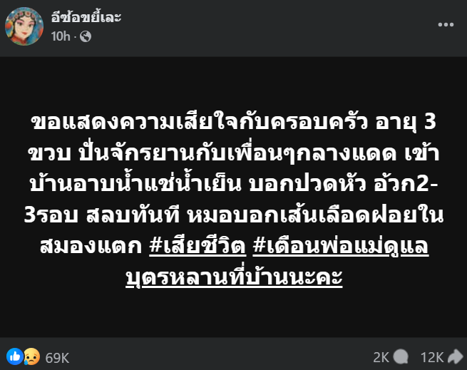 ថ្មីៗនេះ ផេកចែកចាយព័ត៌មានដ៏ល្បីមួយរបស់ថៃ បានទម្លាយពីករណីក្មេងអាយុ ៣ ឆ្នាំម្នាក់ ដែលបានបាត់បង់ជីវិត ក្រោយពីជិះកង់លេងកណ្តាលថ្ងៃក្តៅជាមួយមិត្តភក្តិ ហើយចូលមកផ្ទះងូតទឹកភ្លាមៗ។