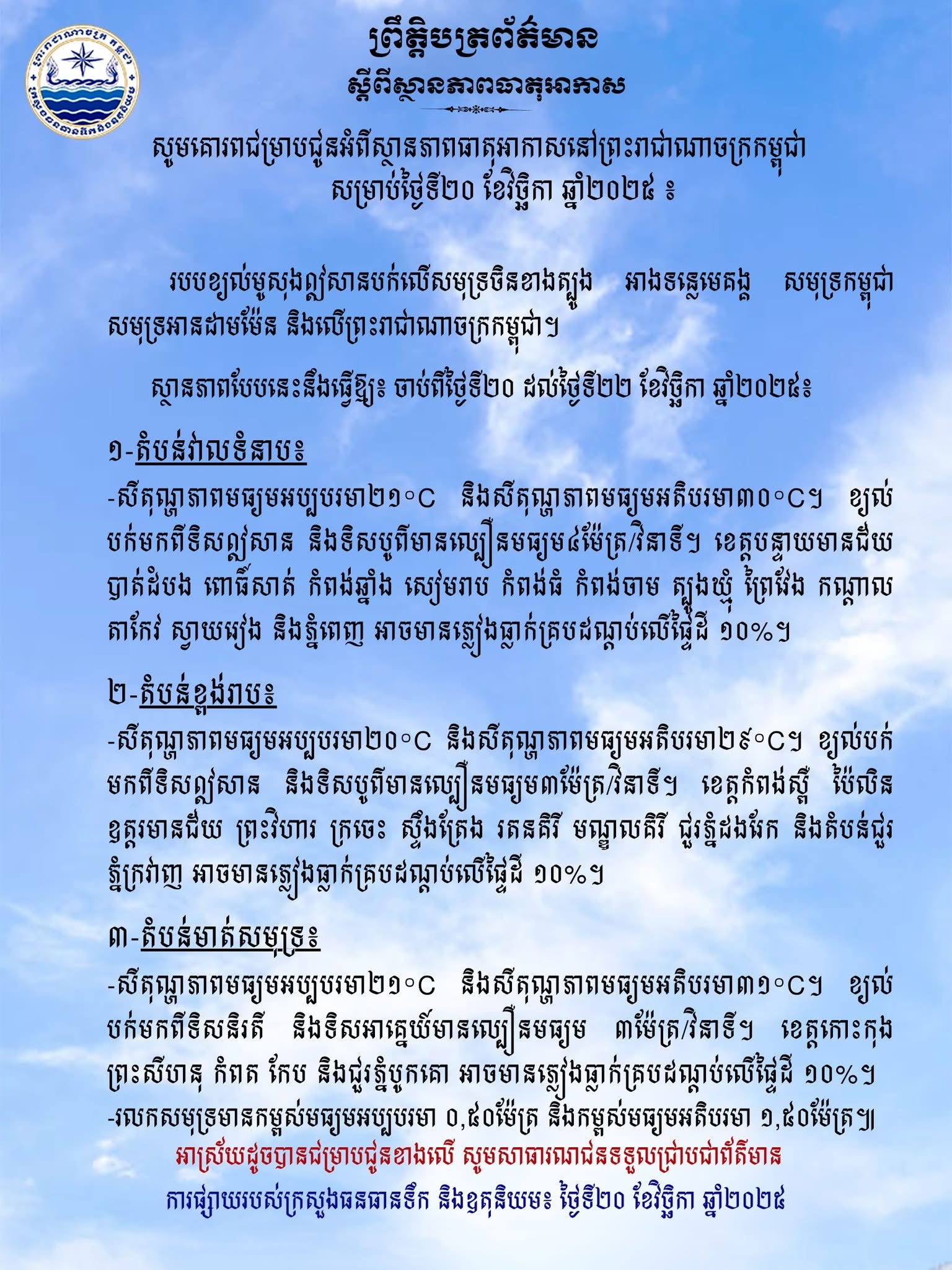 នៅព្រឹកថ្ងៃទី ២០ ខែវិច្ឆិកា ឆ្នាំ ២០២៥ នេះ ក្រសួងធនធានទឹក និង ឧតុនិយម បានចេញសេចក្ដីជូនដំណឹង ស្តីពីស្ថានភាពធាតុអាកាសឱ្យបានដឹងថា របបខ្យល់មូសុងឦសាន បក់លើសមុទ្រចិនខាងត្បូង អាងទន្លេមេគង្គ សមុទ្រកម្ពុជា សមុទ្រអានដាមម៉ែន និង លើព្រះរាជាណាចក្រកម្ពុជា។