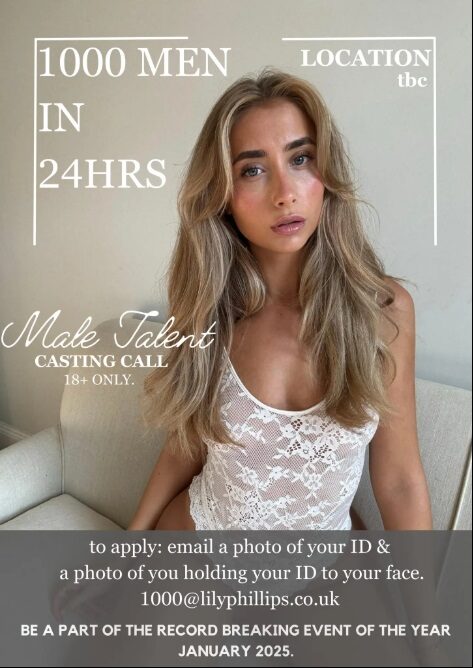 សារព័ត៌មាន New York Post បានរាយការណ៍ឱ្យដឹងថា lily Phillips ជាតារាកុនកូនជ្រូករបស់អង់គ្លេស បានត្រៀមខ្លួននឹងបំបែកឯកត្តកម្មមួយដែលមិននឹកស្មាន ដោយនឹងរួមសង្វាសជាមួយនឹងបុរសឱ្យគ្រប់ចំនួន ១ ពាន់នាក់ ក្នុងរយៈពេលត្រឹមតែ ២៤ ម៉ោង។