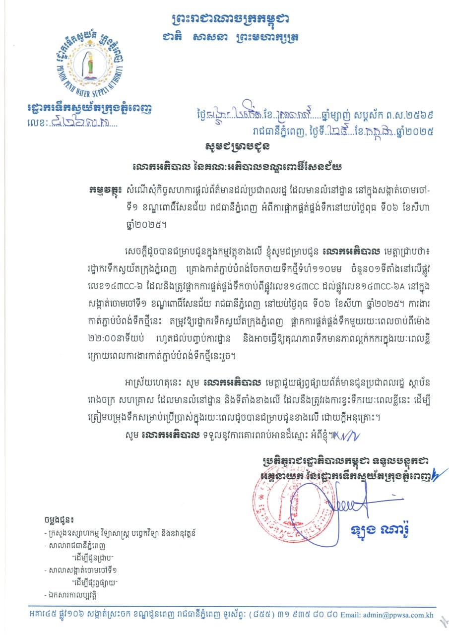 រដ្ឋាករទឹក គ្រោងកាត់ភ្ជាប់បំពង់ចែកចាយទឹកថ្មីទំហំ ១១០ មម ចំនួនមួយទីតាំងនៅលើផ្លូវលេខ ១៤៣CC-៦ ដែលនឹងត្រូវផ្អាកការផ្គត់ផ្គង់ទឹកចាប់ពីផ្លូវលេខ ១៤៣CC ដល់ផ្លូវលេខ ១៤៣CC-៦A នៅក្នុង សង្កាត់ចោមចៅទី ១ ខណ្ឌពោធិ៍សែនជ័យ រាជធានីភ្នំពេញ នៅយប់ថ្ងៃពុធ ទី ០៦ ខែសីហា ឆ្នាំ ២០២៥។ ការងារនេះ តម្រូវឱ្យរដ្ឋាករទឹក ផ្អាកការផ្គត់ផ្គង់ទឹកមួយរយៈពេលចាប់ពីម៉ោង ២២:០០ នាទីយប់ រហូតដល់បញ្ចប់ការដ្ឋាន និង អាចធ្វើឱ្យគុណភាពទឹកមានភាពល្អក់កករក្នុងរយៈពេលខ្លី ក្រោយពេលការងារកាត់ភ្ជាប់បំពង់ទឹកថ្មីនេះរួច៕