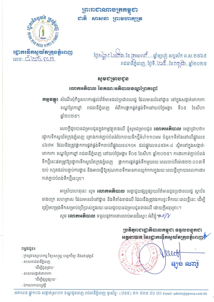 រដ្ឋាករទឹកស្វយ័ត គ្រោងកាត់ភ្ជាប់បំពង់ចែកចាយទឹកថ្មីទំហំ ១១០ មម ចំនួនមួយទីតាំងនៅលើផ្លូវលេខ ៤៦៣K ដែលនឹងត្រូវផ្អាកការផ្គត់ផ្គង់ទឹកចាប់ពីផ្លូវលេខ ៤១០K ដល់ផ្លូវលេខ ៤៥៦K-៤ ស្ថិតនៅក្នុងសង្កាត់គោករកា ខណ្ឌព្រែកព្នៅ រាជធានីភ្នំពេញ នៅយប់ថ្ងៃអង្គារ ទី ០៥ ខែសីហា ឆ្នាំ ២០២៥។ ការងារនេះតម្រូវឱ្យរដ្ឋាករទឹក ផ្អាកការផ្គត់ផ្គង់ទឹកមួយរយៈពេលចាប់ពីម៉ោង ២២:០០ នាទីយប់ រហូតដល់បញ្ចប់ការដ្ឋាន និង អាចធ្វើឱ្យគុណភាពទឹកមានភាពល្អក់កករក្នុងរយៈពេលខ្លីក្រោយពេលការងារកាត់ភ្ជាប់បំពង់ទឹកថ្មីនេះរួច។