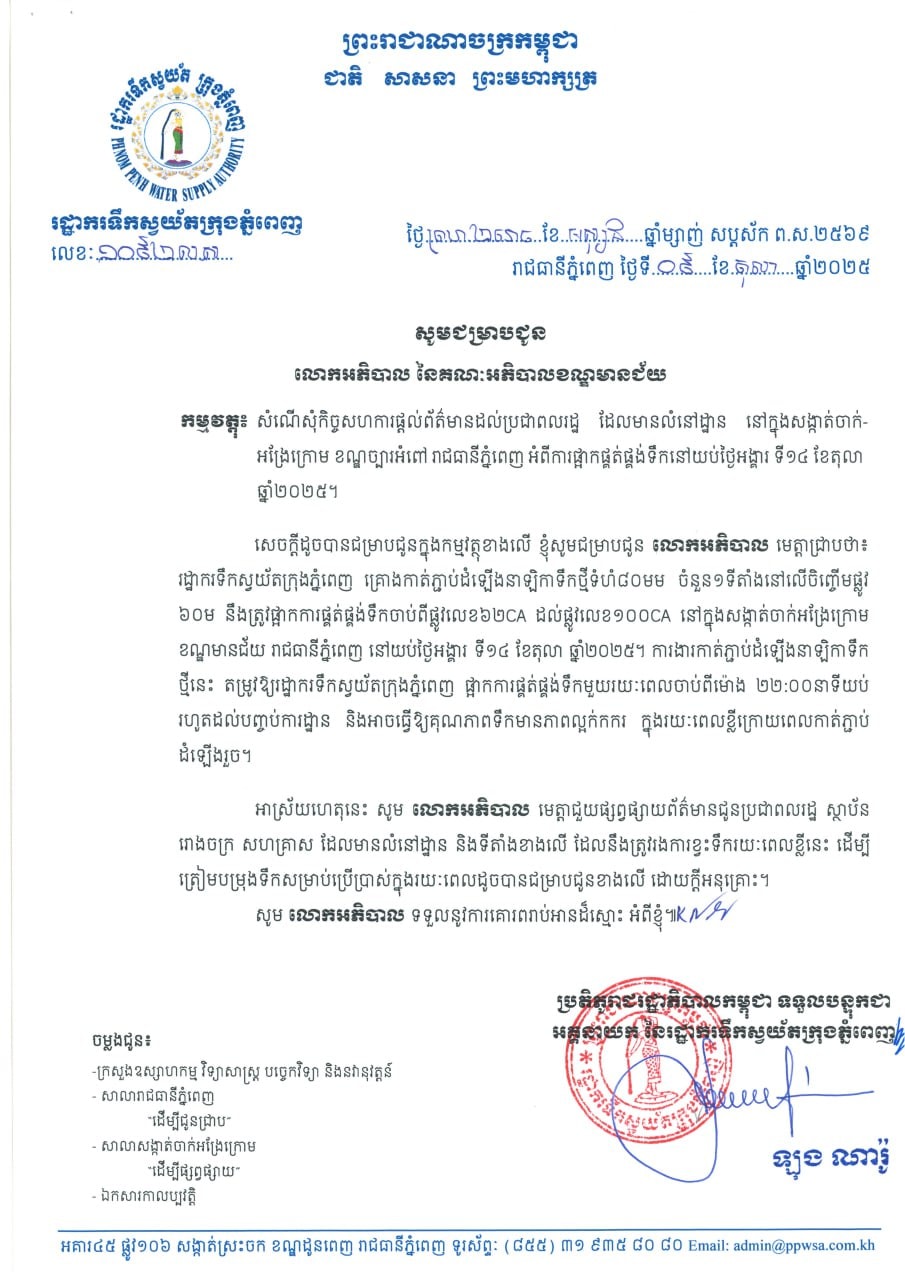 រដ្ឋាករទឹក គ្រោងកាត់ភ្ជាប់ដំឡើងនាឡិកាទឹកថ្មីទំហំ ៨០ មម ចំនួនមួយទីតាំងនៅលើចិញ្ចើមផ្លូវ ៦០ម នឹងត្រូវផ្អាកការផ្គត់ផ្គង់ទឹកចាប់ពីផ្លូវលេខ ៦២CA ដល់ផ្លូវលេខ ១០០CA នៅក្នុងសង្កាត់ចាក់អង្រែក្រោម ខណ្ឌមានជ័យ រាជធានីភ្នំពេញ នៅយប់ថ្ងៃអង្គារ ទី ១៤ ខែតុលា ឆ្នាំ ២០២៥។ ការងារនេះ តម្រូវឱ្យរដ្ឋាករទឹក ផ្អាកការផ្គត់ផ្គង់ទឹកមួយរយៈពេលចាប់ពីម៉ោង ២២:០០ នាទីយប់ រហូតដល់បញ្ចប់ការដ្ឋាន និង អាចធ្វើឱ្យគុណភាពទឹកមានភាពល្អក់កករ ក្នុងរយៈពេលខ្លី។