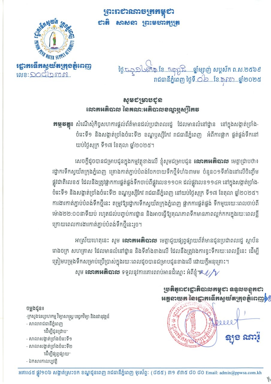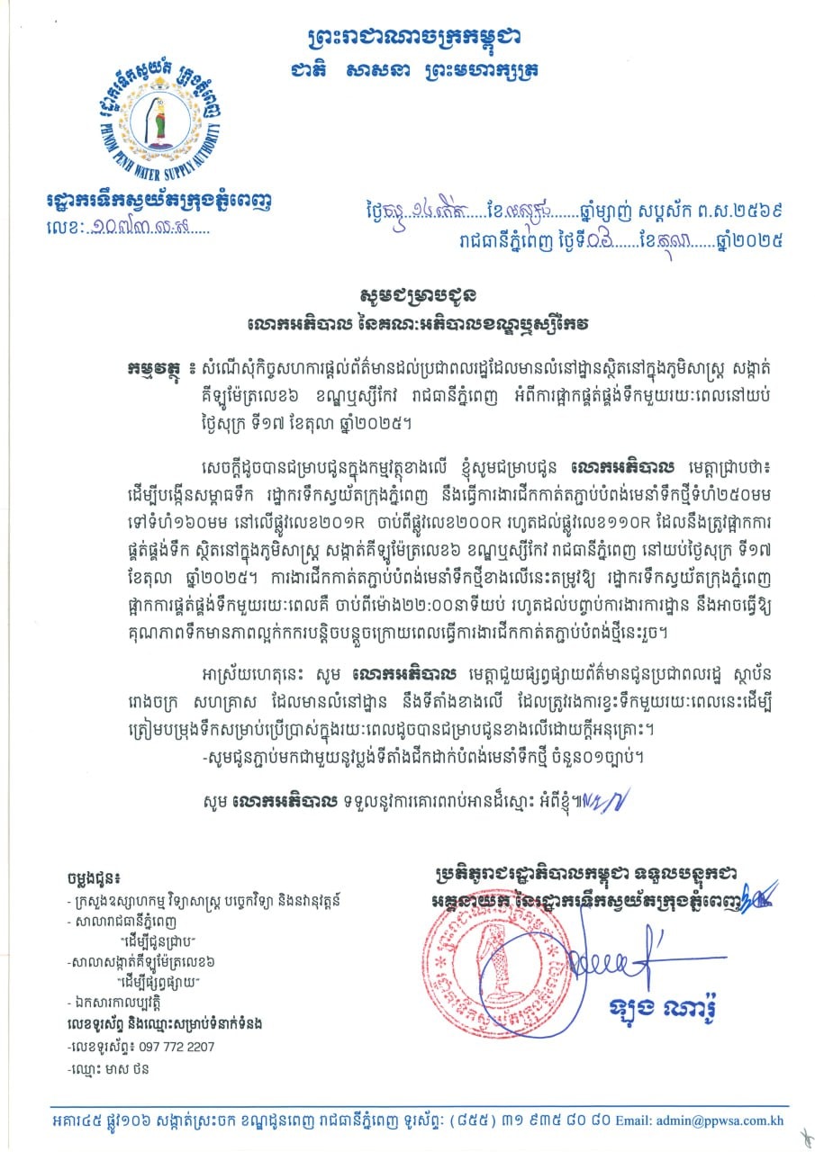 រដ្ឋាករទឹក នឹងធ្វើការងារជីកកាត់តភ្ជាប់បំពង់មេនាំទឹកថ្មីទំហំ ២៥០មម ទៅទំហំ ១៦០មម នៅលើផ្លូវលេខ ២០១R ចាប់ពីផ្លូវលេខ ២០០R រហូតដល់ផ្លូវលេខ ១១០R ដែលនឹងត្រូវផ្អាកការផ្គត់ផ្គង់ទឹក ស្ថិតនៅក្នុងភូមិសាស្ត្រសង្កាត់គីឡូម៉ែត្រលេខ៦ ខណ្ឌឬស្សីកែវ រាជធានីភ្នំពេញ នៅយប់ថ្ងៃសុក្រ ទី ១៧ ខែតុលា ឆ្នាំ ២០២៥។ ការងារនេះ តម្រូវឱ្យរដ្ឋាករទឹក ផ្អាកការផ្គត់ផ្គង់ទឹកមួយរយៈពេលគឺចាប់ពីម៉ោង ២២:០០ នាទីយប់ រហូតដល់បញ្ចប់ការងារការដ្ឋាន នឹងអាចធ្វើឱ្យគុណភាពទឹកមានភាពល្អក់កករបន្តិចបន្តួចក្រោយពេលធ្វើការងារជីកកាត់តភ្ជាប់បំពង់ថ្មីនេះរួច។