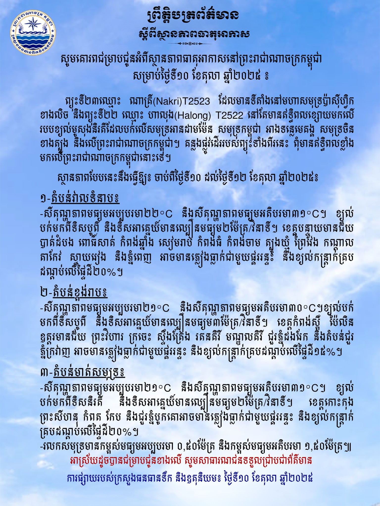 នៅព្រឹកថ្ងៃទី ១០ ខែតុលា ឆ្នាំ ២០២៥ នេះ ក្រសួងធនធានទឹក និង ឧតុនិយម បានចេញសេចក្ដីជូនដំណឹងស្ដីពីស្ថានភាពធាតុអាកាសនៅកម្ពុជា ឱ្យបានដឹងថាព្យុះទី ២៣ ឈ្មោះ ណាគ្រី (Nakri) T2523 ដែលមានទីតាំងនៅមហាសមុទ្រប៉ាស៊ីហ្វិកខាងលិច និង ព្យុះទី ២២ ឈ្មោះ ហាលុង (Halong) T2522 នៅតែមានឥទ្ធិពលខ្សោយមកលើរបបខ្យល់មូសុងនិរតីដែលបក់លើសមុទ្រអានដាមម៉ែន សមុទ្រកម្ពុជា អាងទន្លេមេគង្គ សមុទ្រចិនខាងត្បូង និង លើព្រះរាជាណាចក្រកម្ពុជា ខណៈគន្លងផ្លូវដើររបស់ព្យុះទាំងពីរនេះ ពុំមានឥទ្ធិពលខ្លាំងមកលើកម្ពុជានោះទេ។