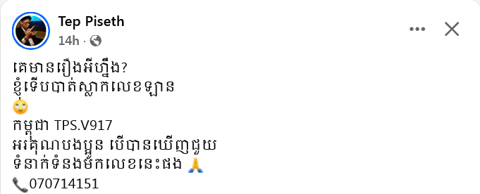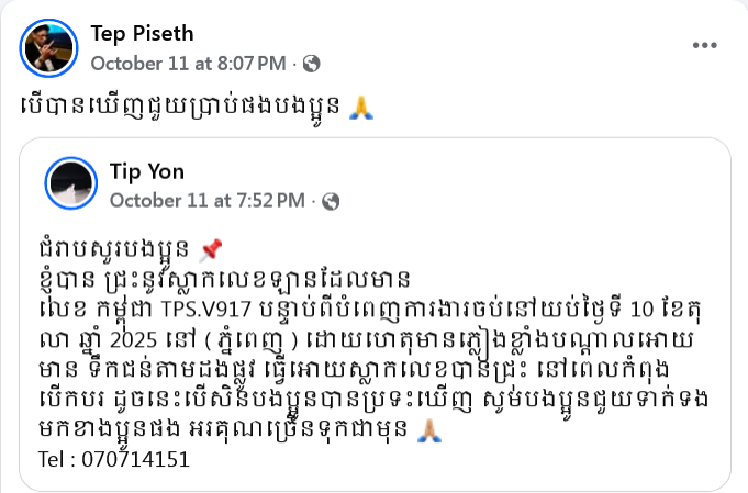 ជាក់ស្តែង បើតាមការបង្ហោះសារចុងក្រោយរបស់លោក នៅថ្ងៃទី ១២ ខែតុលា ឆ្នាំ ២០២៥ កន្លងទៅនេះ លោក ទេព ពិសិដ្ឋ នៅតែប្រកាសស្វែងរកបន្ត បើសិនជាមានបងប្អូនណាបានឃើញ ជួយផ្តល់ដំណឹងដល់លោកផង ដោយស្លាកជ្រុះនោះលេខ «កម្ពុជា TPS.V917»៕