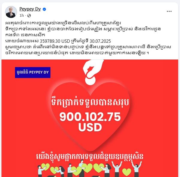 ក្រឡេកមើលហ្វេសប៊ុករបស់អ្នកផ្ដើមមូលនិធិ PeyPey Dy វិញ ពេលនេះលោកក៏បានបង្ហាញនូវថវិកាសរុបដែលទទួលបានពីបងប្អូនសប្បុរសជនកម្ពុជាចំនួនប្រមាណជាង ៩០ ម៉ឺនដុល្លារ ដោយគិតត្រឹមថ្ងៃទី ៣០ ខែកក្កដា ឆ្នាំ ២០២៥ កន្លងទៅនេះ លោកបានចំណាយអស់ជាង ៣៥ ម៉ឺនដុល្លារក្នុងការចាត់ចែងរៀបចំស្បៀងសម្ភារៈ និង ថវិកាជូនកងទ័ពជួរមុខ និង ជនភៀសសឹក។