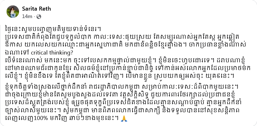 នៅព្រឹកថ្ងៃទី ១៣ ខែវិច្ឆិកា ឆ្នាំ ២០២៥ នេះ អ្នកលេងបណ្តាញសង្គមហ្វេសប៊ុក ជាពិសេស អ្នកគាំទ្រ Miss Universe Cambodia 2020 រ៉េត សារីតា បាន និង កំពុងចាប់អារម្មណ៍នឹងសំណេរមួយរបស់នាង ដែលបានបង្ហោះឡើយនៅលើគណនីហ្វេសប៊ុកផ្ទាល់ខ្លួន។