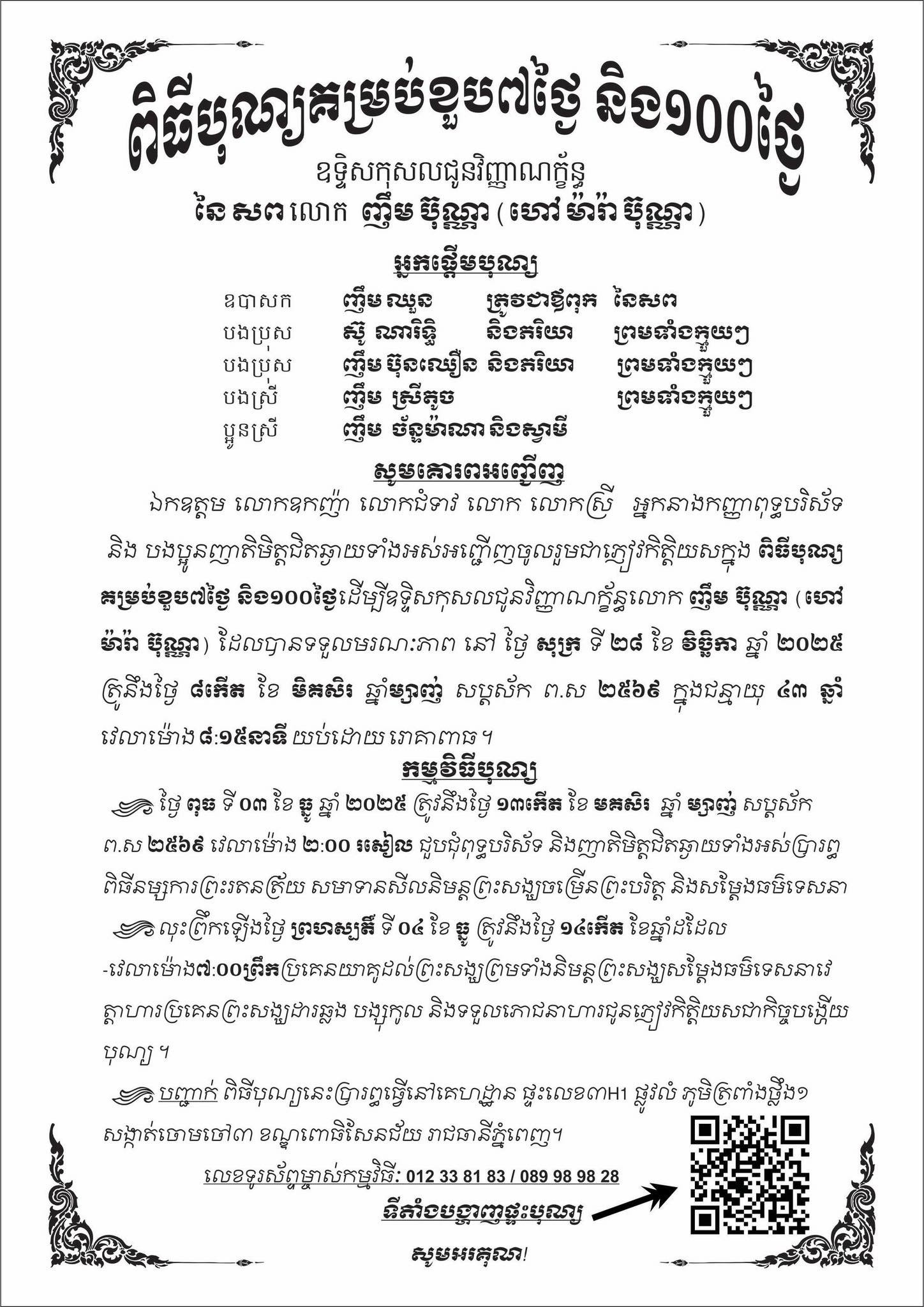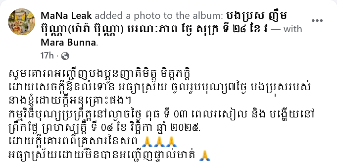 យ៉ាងណាមិញ ក្រោយពិធីបូជាសពបានរៀបចំទៅតាមប្រពៃណីហើយនោះ បើតាមការជូនដំណឹងពីប្អូនប្រុស ប្អូនស្រីរបស់លោក ម៉ារ៉ា ប៊ុណ្ណា បានជម្រាបថា ពិធីបុណ្យ ៧ ថ្ងៃបងប្រុស នឹងរៀបចំនៅរសៀលថ្ងៃទី ០៣ និង ព្រឹកថ្ងៃទី ០៤ ខែវិច្ឆិកា ឆ្នាំ ២០២៥ ខាងមុខនេះ នៅឯគេហដ្ឋាន។ ក្នុងនោះ ក្រុមគ្រួសាររបស់លោក ម៉ារ៉ា ប៊ុណ្ណា ក៏ជូនដំណឹង និង គោរពអញ្ជើញដល់អ្នកស្គាល់បងប្រុសចូលរួម ដោយក្តីអនុគ្រោះផងដែរ៕