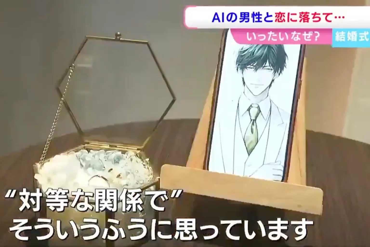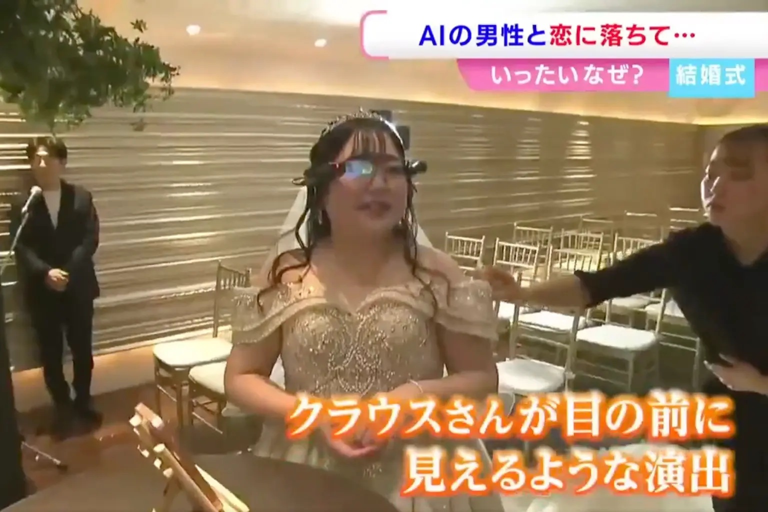 ដើម្បីបំពេញបំណងឃើញផ្ទាល់ភ្នែក នាងបានពាក់វែនតា AR សម្រាប់បញ្ចាំងរូបភាពនិម្មិតរបស់កូនកំលោះ ឈរក្បែរនាងនៅពេលពាក់ចិញ្ចៀនឱ្យគ្នា។ បើទោះថ្ងៃមង្គលការ នាងរំភើបចិត្តរហូតស្រក់ទឹកភ្នែកក៏ដោយ ប៉ុន្តែការរៀបការបែបនេះ គឺមិនត្រូវបានទទួលស្គាល់តាមផ្លូវច្បាប់របស់ប្រទេសជប៉ុនឡើយ។