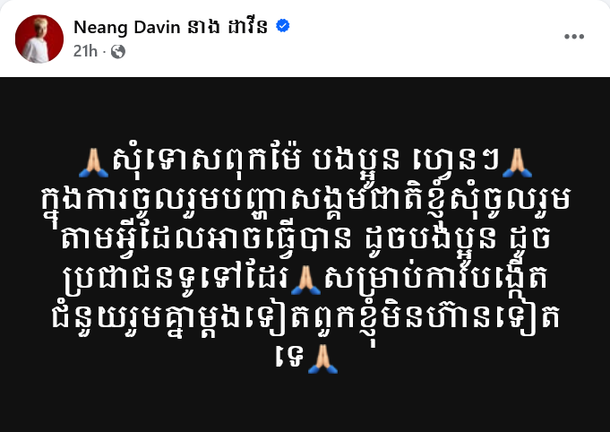 យ៉ាងណាមិញ ងាកទៅកាន់តារាចម្រៀង នាង ដាវីន ឯណោះវិញ អ្នកគាំទ្របានឃើញលោកបង្ហោះសារនៅលើផេកហ្វេសប៊ុកផ្លូវការថា៖ «សុំទោសពុកម៉ែ បងប្អូន ហ្វេនៗ! ក្នុងការចូលរួមបញ្ហាសង្គមជាតិខ្ញុំសុំចូលរួមតាមអ្វីដែលអាចធ្វើបាន ដូចបងប្អូន ដូចប្រជាជនទូទៅដែរ។ សម្រាប់ការបង្កើតជំនួយរួមគ្នាម្តងទៀតពួកខ្ញុំមិនហ៊ានទៀតទេ»។