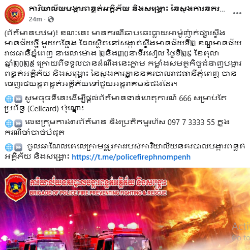 តាមប្រភព បានឱ្យដឹងថា ខណៈនេះ មានករណីឆាបឆេះធ្លាយអាម៉ូញ៉ាក់នៅផ្សារស្ទឹងមានជ័យថ្មី មួយកន្លែង ដែលស្ថិតនៅសង្កាត់ស្ទឹងមានជ័យទី ២ ខណ្ឌមានជ័យ រាជធានីភ្នំពេញ នាវេលាម៉ោង ២ និង ៣០ នាទីរសៀល ថ្ងៃទី ២៩ ខែតុលា ឆ្នាំ២០២៥ ក្រោយពីទទួលបានដំណឹងនេះភ្លាម កម្លាំងសមត្ថកិច្ចជំនាញបង្ការពន្លត់អគ្គិភ័យ និង សង្គ្រោះ នៃស្នងការដ្ឋាននគរបាលរាជធានីភ្នំពេញ បានចេញរថយន្តពន្លត់អគ្គិភ័យទៅជួយអន្តរាគមន៍ផងដែរ។ សម្រាប់ព័ត៌មានលម្អិតបន្ថែម យើងនឹងជម្រាបជូននៅពេលក្រោយ៕