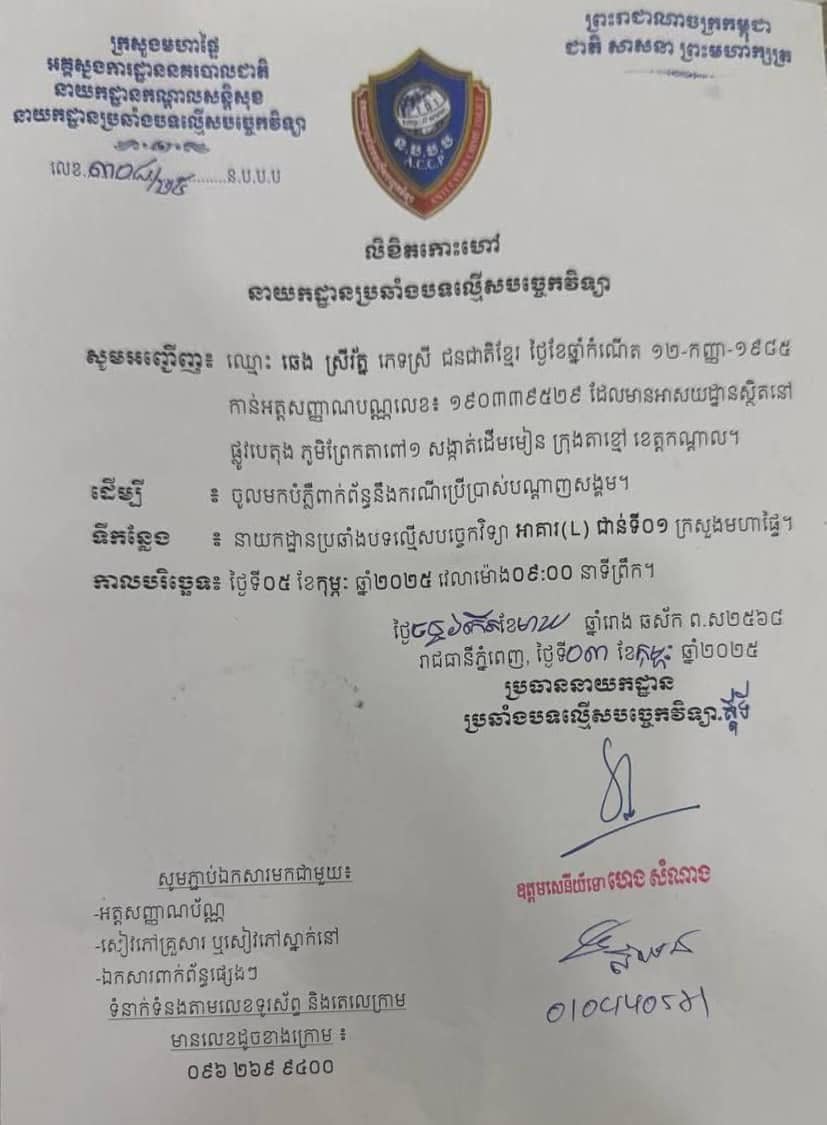 ជាស្ដែង តាមរយៈលិខិតរបស់នាយកដ្ឋានប្រឆាំងបទល្មើសបច្ចេកវិទ្យា ចុះនៅថ្ងៃទី ០៣ ខែកុម្ភៈ ឆ្នាំ ២០២៥ បានកោះហៅបុគ្គលឈ្មោះ ឆេង ស្រីរ័ត្ន មានអាស័យដ្ឋាននៅផ្លូវបេតុង ភូមិព្រែកតាពៅ១ សង្កាត់ដើមមៀន ក្រុងតាខ្មៅ ខេត្តកណ្ដាល ឱ្យចូលខ្លួនបំភ្លឺវេលាម៉ោង ៩ ព្រឹកថ្ងៃទី ០៥ ខែកុម្ភៈ ឆ្នាំ ២០២៥ នេះ នៅអគារL ជាន់ទី ១ នៃនាយកដ្ឋានប្រឆាំងបទល្មើសបច្ចេកវិទ្យា ក្រសួងមហាផ្ទៃ។
