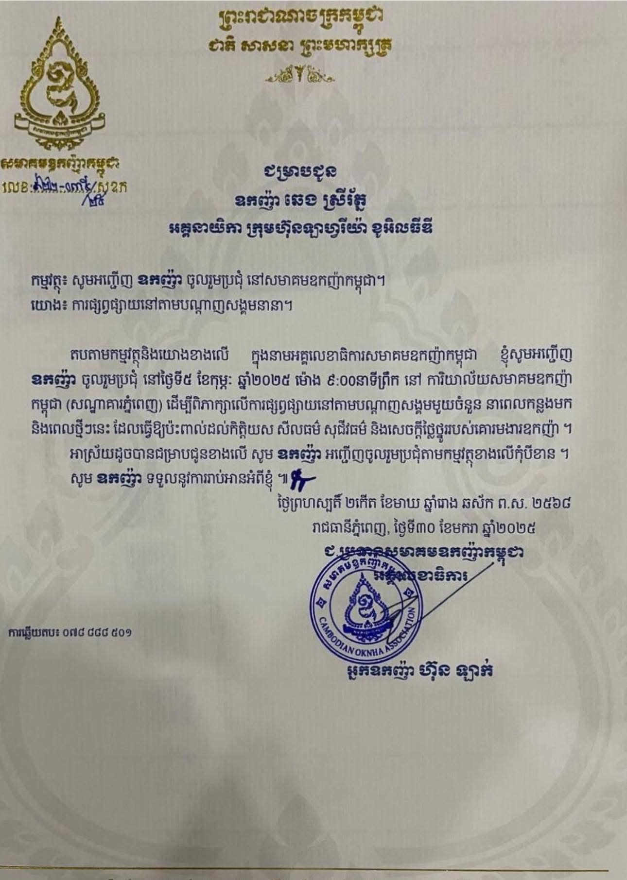 ក្នុងនោះ តាមរយៈសមាគមឧកញ៉ាកម្ពុជា តាមរយៈលិខិតចុះថ្ងៃទី ៣០ ខែមករា ឆ្នាំ ២០២៥ ក៏បានអញ្ជើញឧកញ៉ា ឈ្មោះ ឆេង ស្រីរ័ត្ន ឱ្យចូលរួមប្រជុំនៅសមាគមឧកញ៉ាកម្ពុជា នៅម៉ោង ៩ ព្រឹក ថ្ងៃទី ០៥ ខែកុម្ភៈ ឆ្នាំ ២០២៤ ផងដែរ ទាក់ទងទៅនឹងការផ្សព្វផ្សាញនៅតាមបណ្ដាញសង្គមនានា៕