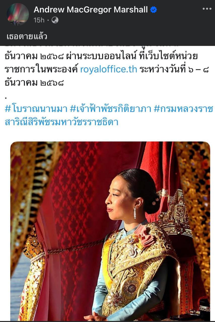 ងាកទៅខាងក្រោយបន្តិច លោក Andrew MacGregor Marshall នេះហើយ ដែលជាអ្នកបានទម្លាយលើកមុនថា មាតារបស់ស្តេចថៃបានសុគត តែត្រូវគេបិទបាំង និង ប្រើវេជ្ជសាស្រ្តរក្សាទុកឱ្យបានយូរ រង់ចាំពេលវេលាត្រឹមត្រូវ។ លុះក្រោយមក នៅថ្ងៃទី ២៤ ខែតុលា ឆ្នាំ ២០២៥ ខាងព្រះរាជវាំងថៃ ក៏បានឱ្យដំណឹងថា មាតាស្តេចថៃ គឺព្រះនាង ស៊ីរីគិត បានសោយទីវង្គតពិតមែន។