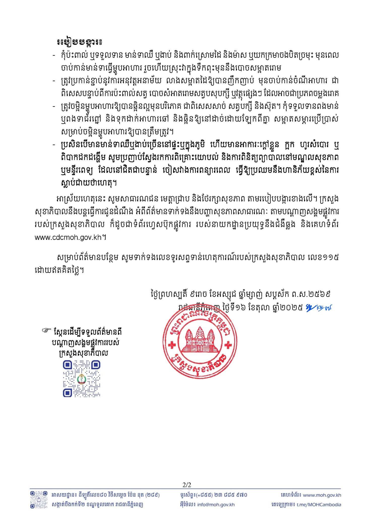 នៅថ្ងៃទី ១៦ ខែតុលា ឆ្នាំ ២០២៥ ក្រសួងសុខាភិបាល បានចេញសេចក្តីប្រកាសព័ត៌មាន មានអ្នកជំងឺផ្តាសាយបក្សីមួយករណីទៀត កើតលើកុមារីអាយុ ៣ ឆ្នាំ ដែលបានបញ្ជាក់ថា វិជ្ជមានវីរុសផ្តាសាយបក្សី ប្រភេទហាស់៥ អ៊ុន១ (H5N1) ដោយវិទ្យាស្ថានជាតិសុខភាពសាធារណៈ និង វិទ្យាស្ថានប៉ាស្ទ័រកម្ពុជា នៅថ្ងៃទី ១៥ ខែតុលា ឆ្នាំ ២០២៥។