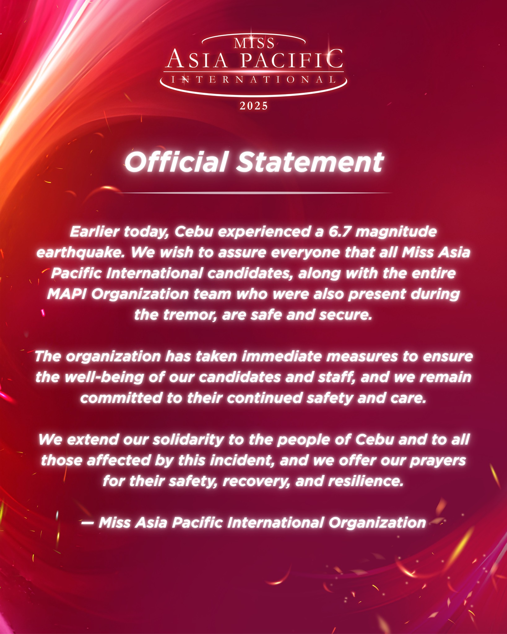 គួរបញ្ជាក់ថា នៅយប់ថ្ងៃទី ៣០ ខែតុលា ឆ្នាំ ២០២៥ កន្លងទៅ កម្មវិធី Miss Asia Pacific International 2025 ក្នុងវគ្គ Gala Night បានដំណើរការយ៉ាងរលូនទៅហើយ ប៉ុន្តែស្រាប់តែមានគ្រោះរញ្ជួយដីកម្រិត 6.7 រ៉ិចទ័រ នៅទីក្រុងសេប៊ូ ប្រទេសហ្វីលីពីន៕