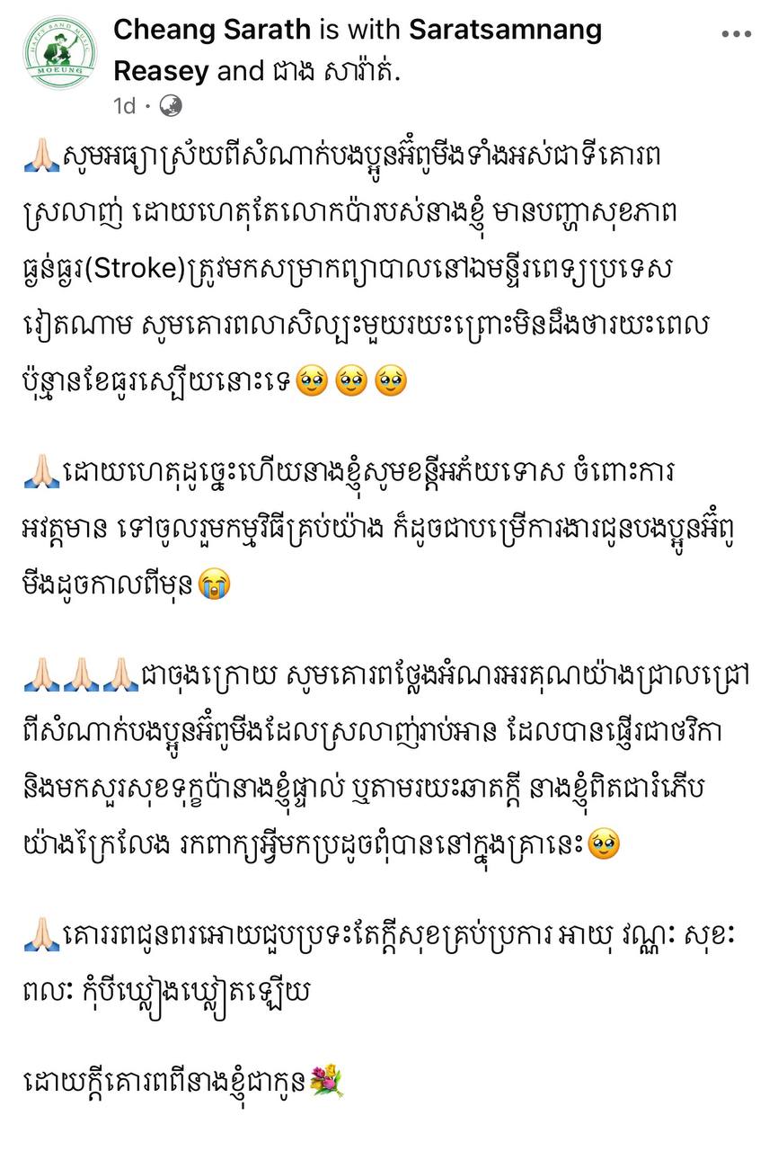 តាមរយៈការជូនដំណឹងបានរៀបរាប់ថា៖ «សូមអធ្យាស្រ័យពីសំណាក់បងប្អូនអ៊ំពូមីងទាំងអស់ជាទីគោរពស្រលាញ់ ដោយហេតុតែលោកប៉ារបស់នាងខ្ញុំ មានបញ្ហាសុខភាពធ្ងន់ធ្ងរ (Stroke) ត្រូវមកសម្រាកព្យាបាលនៅឯមន្ទីរពេទ្យប្រទេសវៀតណាម សូមគោរពលាសិល្បៈមួយរយៈ ព្រោះមិនដឹងថារយៈពេលប៉ុន្មានខែធូរស្បើយនោះទេ។ ដោយហេតុដូច្នេះហើយ នាងខ្ញុំសូមខន្តីអភ័យទោស ចំពោះការអវត្តមាន ទៅចូលរួមកម្មវិធីគ្រប់យ៉ាង ក៏ដូចជាបម្រើការងារជូនបងប្អូនអ៊ំពូមីងដូចកាលពីមុន។