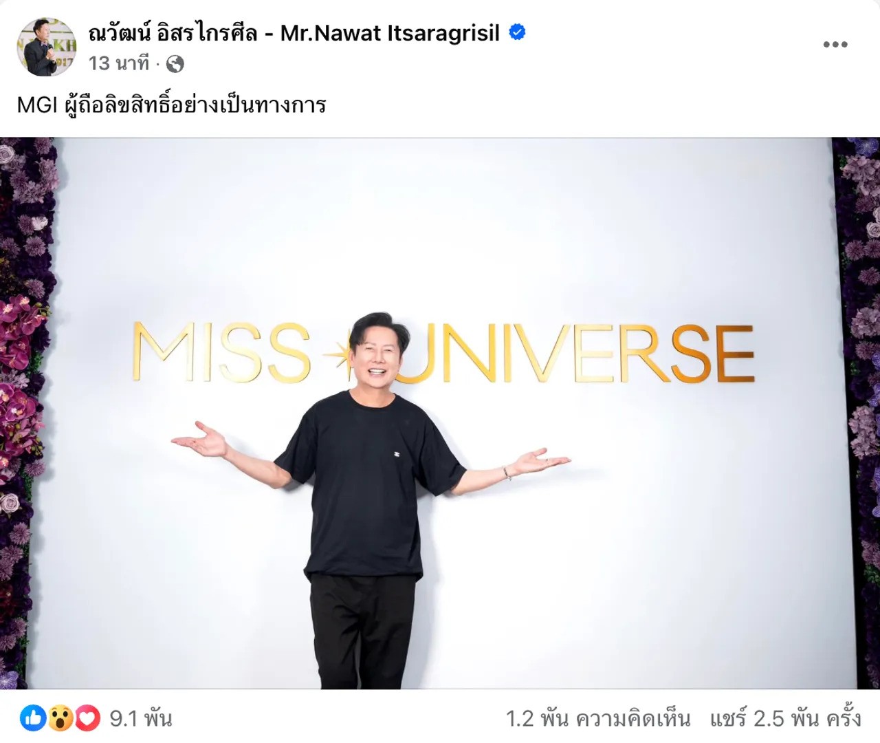 ភ្ញាក់ផ្អើល! តា Nawat មេធំ MGI ទិញសិទ្ធិគ្រប់គ្រង និង រៀបចំការប្រកួត Miss Universe Thailand ចាប់ពីឆ្នាំ ២០២៥ នេះទៅ
