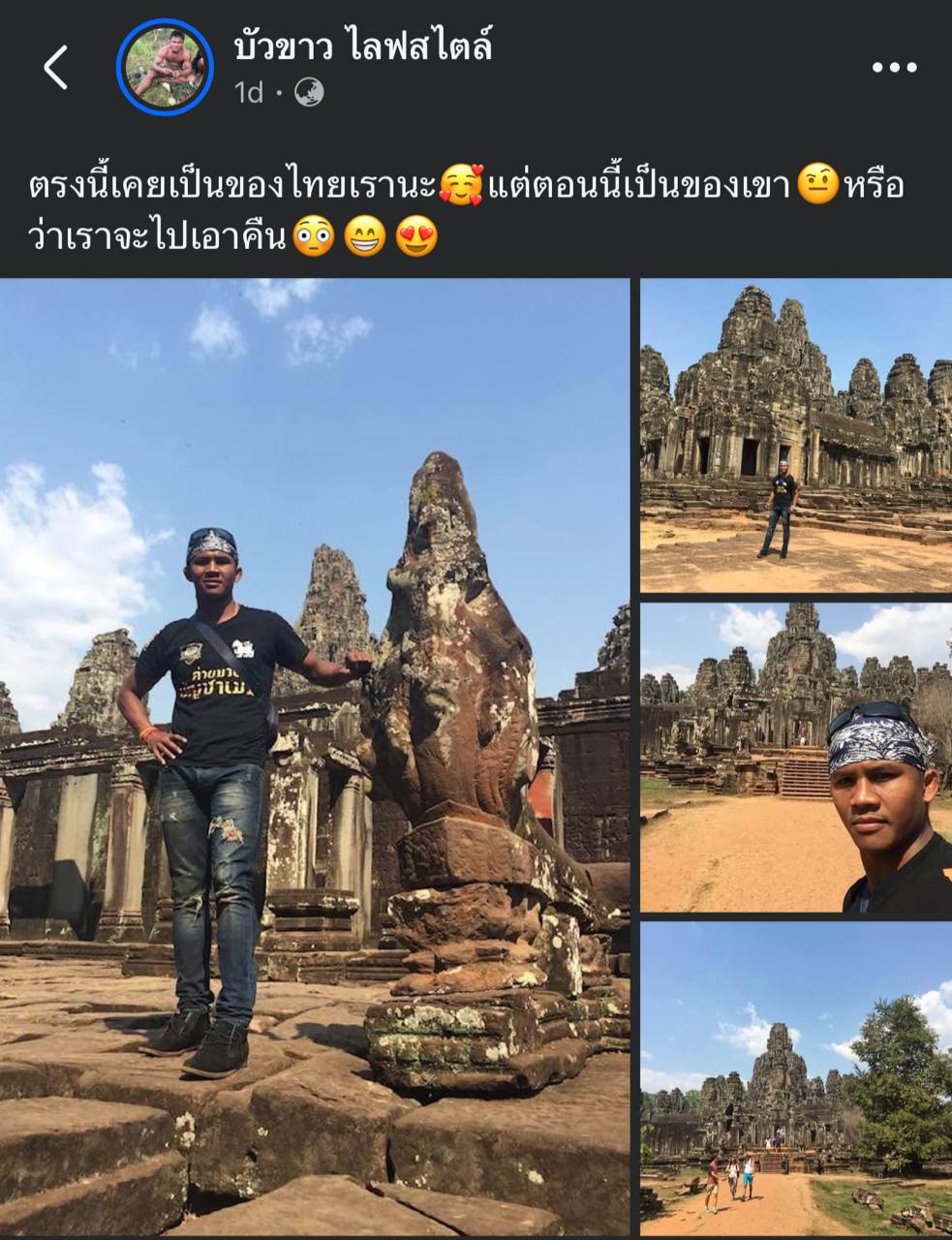 ក្នុងនោះ អ្នកប្រដាល់បែកសតិវង្វេងប្រវត្តិសាស្ត្ររូបនេះ បានបង្ហោះរូបរបស់ខ្លួនដែលធ្លាប់បានមកលេងប្រាសាទបាយ័ន ឬ អង្គរធំ នាទឹកដីខេត្តសៀមរាប ប្រទេសកម្ពុជា រួចដាក់ចំណងជើងបែបឌឺដងថា ៖ «ត្រង់នេះធ្លាប់ជារបស់ថៃ តែឥឡូវជារបស់គេ ឬ មួយយើងគួរតែយកត្រឡប់មកវិញ?»។