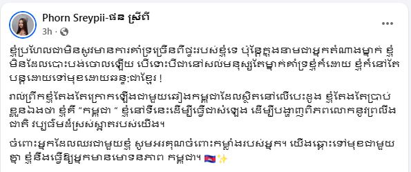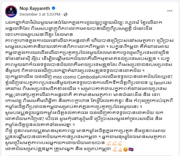 ចុះកម្ពុជាយើង ចង់ឃើញ Miss Cosmo Cambodia របស់យើងទទួលបានជោគជ័យដែរឬទេ? ខ្ញុំឃើញថាបេក្ខភាពប្រទេសនីមួយៗ គេទទួលបានការលើកទឹកចិត្តពីប្រជាជន ឬ Fans របស់គេណាស់ ពិសេសប្រទេសជិតខាងយើង។ សម្រាប់គាត់ជាបេក្ខភាពតំណាងឱ្យប្រទេសកម្ពុជាទៅប្រកួតលើឆាកអន្តរជាតិ គាត់មានសមត្ថភាព មានចំណេះដឹង និង ទេពកោសល្យ ពិសេសគឺមហិច្ឆតា និង ភាពក្លាហាន តែអ្វីដែលគាត់ខ្វះ និង កំពុងត្រូវការបំផុត គឺកម្លាំងចិត្តពីប្រជាជនកម្ពុជាសម្រាប់គាត់ក្នុងការប្រកួតប្រជែងមួយនេះ។ សូមបងប្អូនជួយផ្តល់កម្លាំងចិត្តដល់គាត់ផង ចង់ឃើញគាត់ទទួលបានជោគជ័យ យកជោគជ័យមកវិញទេ? បើចង់ សូមកុំនៅស្ងៀមអី ប្រើប្រាស់សំឡេងគាំទ្ររបស់យើង និង កម្លាំងចិត្តជូនដល់គាត់ទាំងអស់គ្នា។ ពីខ្ញុំ ជូនពរឱ្យប្អូនមានសុខភាពល្អ មានកម្លាំងចិត្តក្នុងការប្រកួត និង ជូនពរឱ្យប្អូនដណ្តើមបានជោគជ័យមកកាន់ប្រទេសកម្ពុជា។ អ្នកជាមនុស្សដែលមានសមត្ថភាព សូមប្រើសមត្ថភាពរបស់អ្នកយកជោគជ័យឱ្យបាន ជោគជ័យសម្រាប់ខ្លួនអ្នក គ្រួសារអ្នក និង សម្រាប់កម្ពុជា»៕
