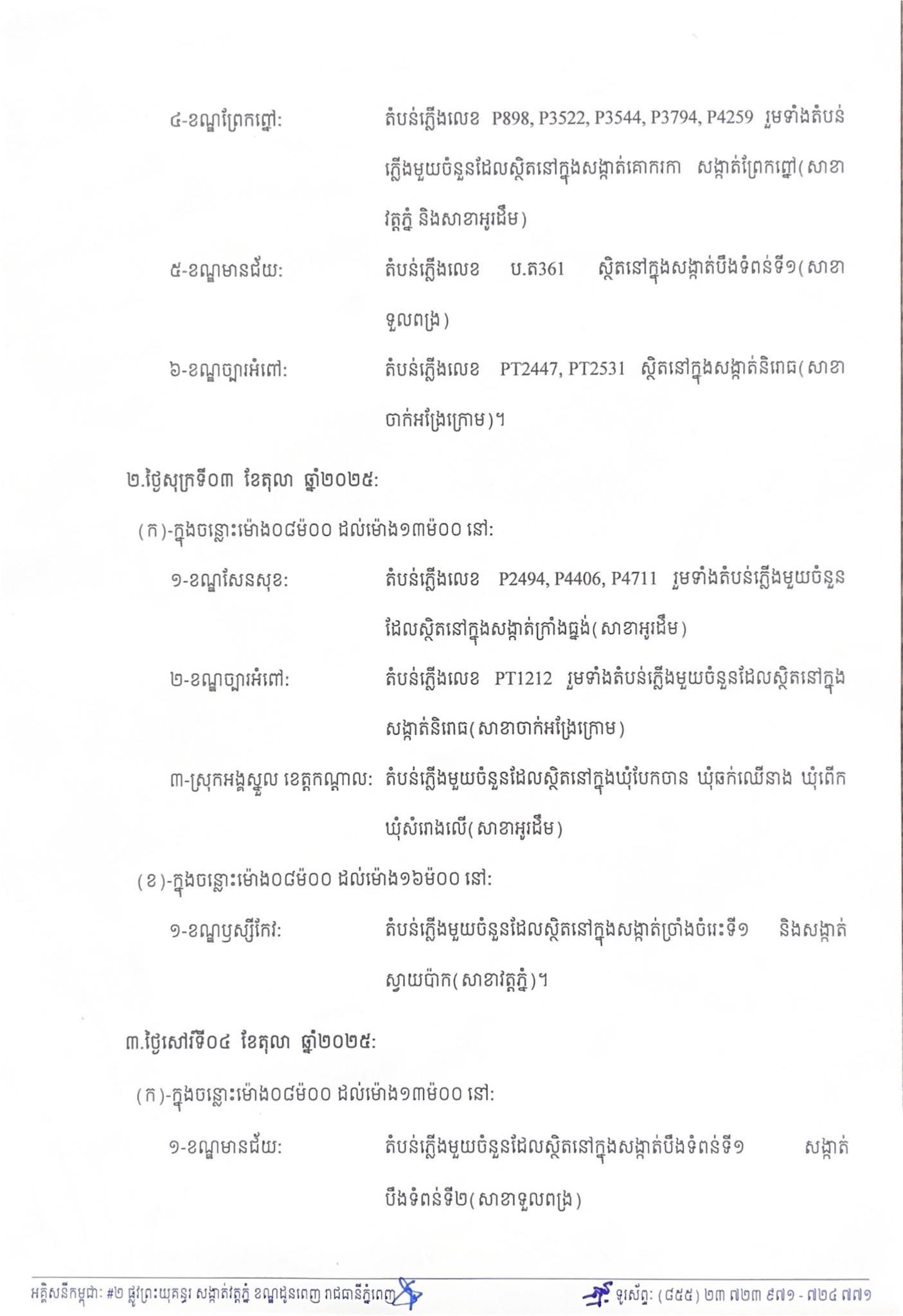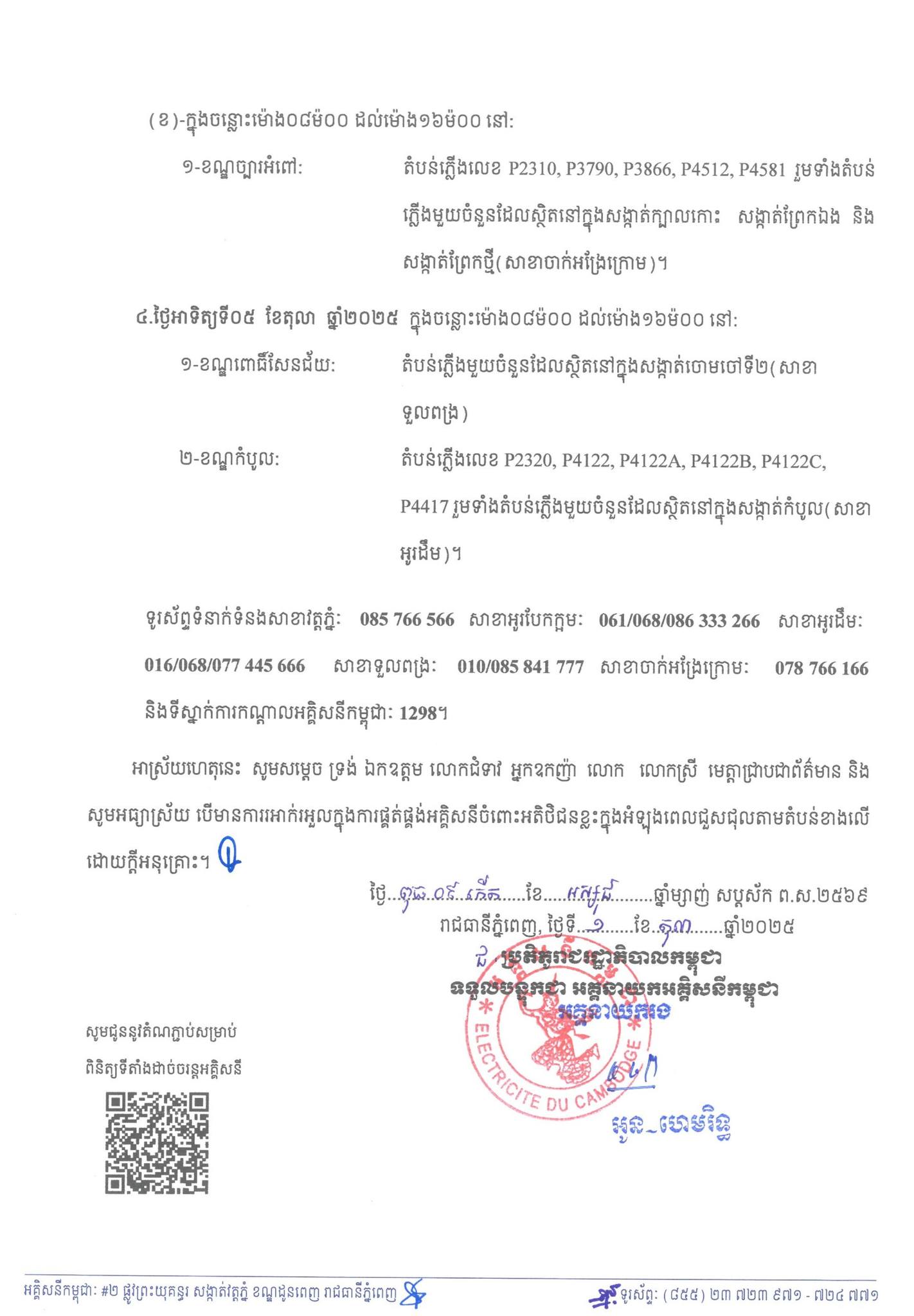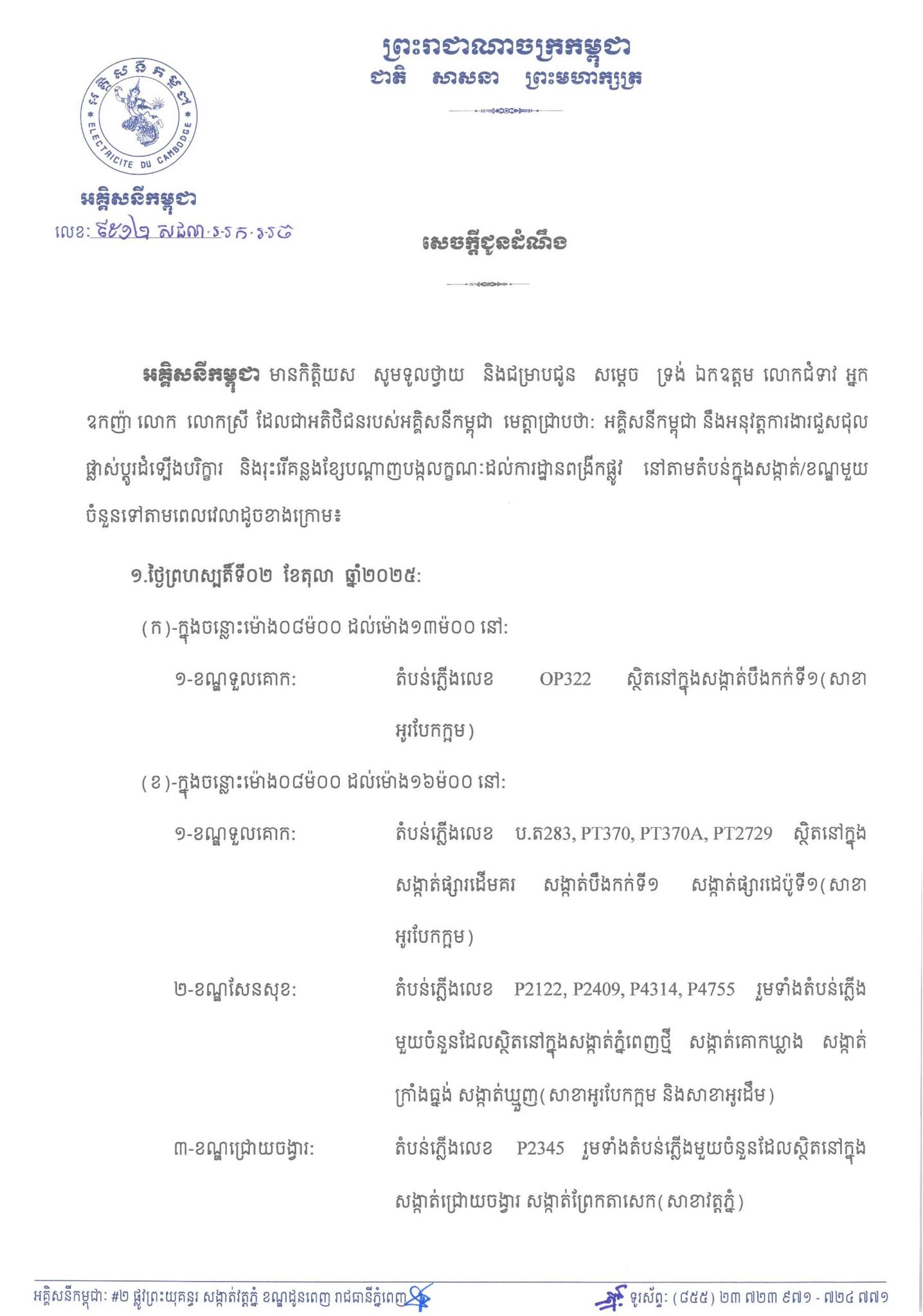 នៅថ្ងៃទី ០១ ខែតុលា ឆ្នាំ ២០២៥ នេះ អគ្គិសនីកម្ពុជា បានជូនដំណឹងស្ដីពីការអនុវត្តការងារជួសជុល ផ្លាស់ប្ដូរដំឡើងបរិក្ខារនានា និង រុះរើគន្លងខ្សែបណ្ដាញអគ្គិសនី របស់អគ្គិសនីកម្ពុជា ដើម្បីបង្កលក្ខណៈងាយស្រួលដល់ការដ្ឋានពង្រីកផ្លូវ ដែលធ្វើឱ្យមានបញ្ហារអាក់រអួលចរន្តអគ្គិសនីប្រើប្រាស់ នៅតំបន់មួយចំនួនទៅតាមពេលវេលា ចាប់ពីថ្ងៃទី ០២ ខែតុលា ឆ្នាំ ២០២៥ ស្អែកនេះ ដល់ថ្ងៃទី ០៥ ខែតុលា ឆ្នាំ ២០២៥។