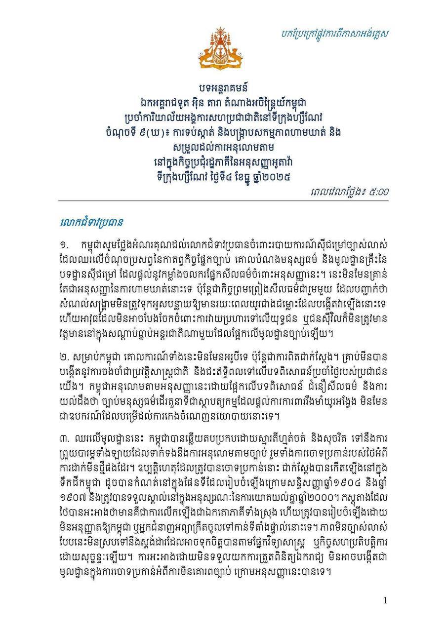 នៅថ្ងៃទី ០៤ ខែធ្នូ ឆ្នាំ ២០២៥ តំណាងអចិន្ត្រៃយ៍របស់កម្ពុជា ប្រចាំអង្គការសហប្រជាជាតិ នៅទីក្រុងហ្ស៊ឺណែវ លោកឯកអគ្គរាជទូត អ៊ិន តារា បានធ្វើបទអន្តរាគមន៍ ក្រោមរបៀបវារៈទី ៩ ស្តីពីការទប់ស្កាត់ និង បង្ក្រាបសកម្មភាពហាមឃាត់ និង សម្រួលដល់ការអនុលោមភាពនៃអនុសញ្ញា នៅក្នុងកិច្ចប្រជុំរដ្ឋភាគីនៃអនុសញ្ញាហាមឃាត់មីន។