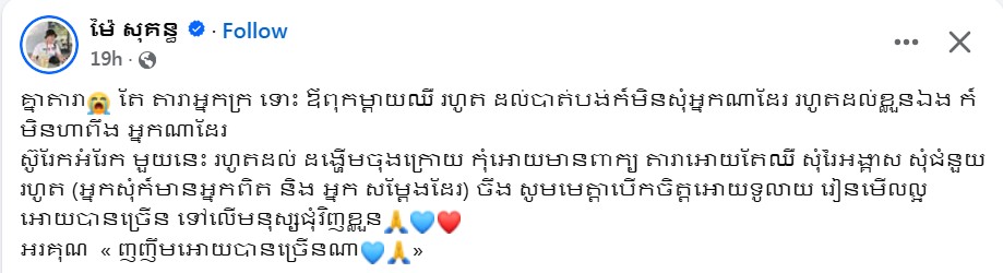 សារនោះ លោក ម៉ៃ សុគន្ធ បានរៀបរាប់ថា៖ «គ្នាតារា! តែតារាអ្នកក្រ ទោះឪពុកម្តាយឈឺ រហូតដល់បាត់បង់ក៏មិនសុំអ្នកណាដែរ រហូតដល់ខ្លួនឯង ក៏មិនហាពឹង អ្នកណាដែរ។ ស៊ូរែកអម្រែកមួយនេះ រហូតដល់ដង្ហើមចុងក្រោយ កុំឱ្យមានពាក្យ តារាឱ្យតែឈឺ សុំរៃអង្គាស សុំជំនួយរហូត (អ្នកសុំក៏មានអ្នកពិត និង អ្នកសម្តែងដែរ) ចឹង! សូមមេត្តាបើកចិត្តឱ្យទូលាយ រៀនមើលល្អឱ្យបានច្រើន ទៅលើមនុស្សជុំវិញខ្លួន។ អរគុណ! ញញឹមឱ្យបានច្រើនណា»៕