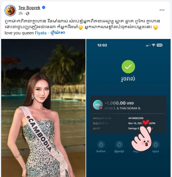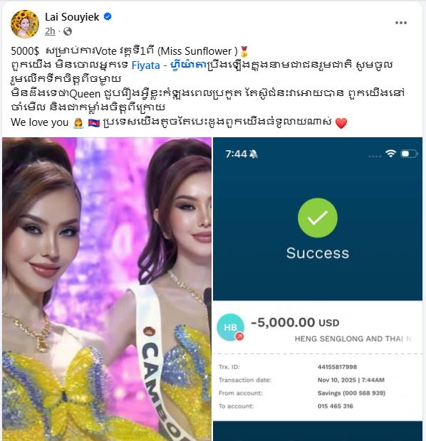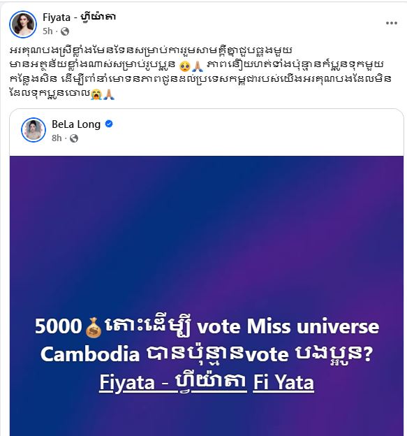 «៥០០០$ សម្រាប់ការ Vote វគ្គទី ១ ពី (Miss Sunflower ) ពួកយើង មិនចោលអ្នកទេ Fiyata – ហ្វីយ៉ាតា ប្រឹងឡើងក្នុងនាមជាជនរួមជាតិ សូមចូលរួមលើកទឹកចិត្តពីចម្ងាយ មិនដឹងទេថា Queen ជួបរឿងអ្វីខ្លះកំឡុងពេលប្រកួត តែស៊ូជម្នះវាឱ្យបាន ពួកយើងនៅចាំមើល និង ជាកម្លាំងចិត្តពីក្រោយ We love you ប្រទេសយើងតូច តែបេះដូងពួកយើងធំទូលាយណាស់»។