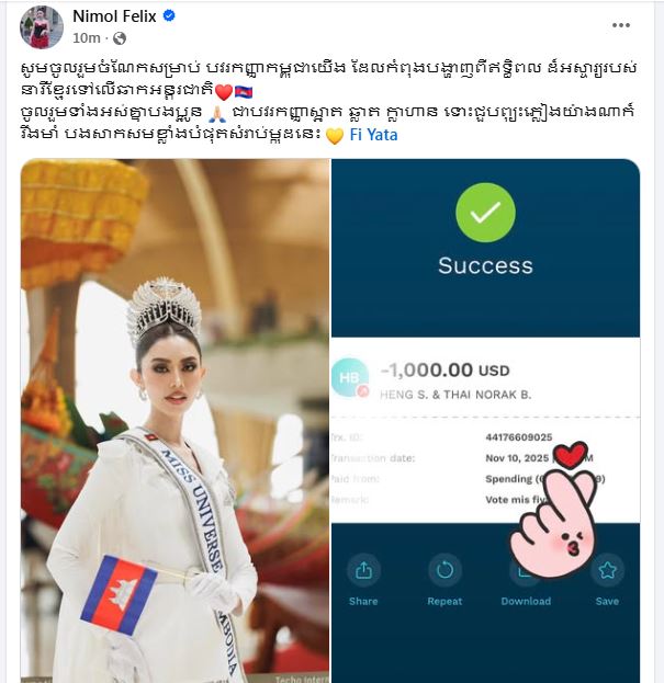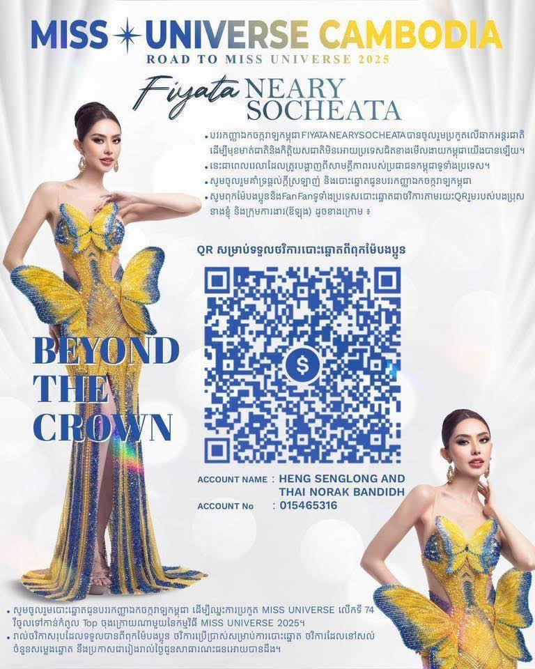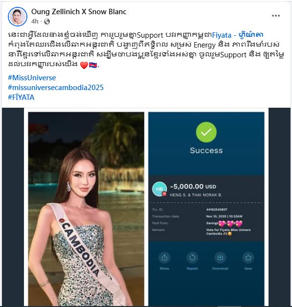ពិតណាស់ ស្របពេលបវរកញ្ញាកម្ពុជា ហ្វីយ៉ាតា កំពុងស្ថិតក្នុងដំណើរការប្រកួតកម្មវិធីអន្តរជាតិ Miss Universe 2025 យ៉ាងសកម្មមោះមុត។ ងាកមើលមហាជនអ្នកគាំទ្រវិស័យបវរកញ្ញា ក៏ដូចជាសិល្បករកម្ពុជា និង បុគ្គលល្បីៗលើបណ្ដាញសង្គមជាច្រើនរូបវិញ ក៏កំពុងខ្នះខ្នែងខ្លាំងទាក់ទងនឹងដំណើរការបោះឆ្នោតឱ្យអ្នកនាង ហ្វីយ៉ាតា ខណៈកម្មវិធី Miss Universe មានការបើកឱ្យបោះឆ្នោតគាំទ្រចំពោះបេក្ខភាពបវរកញ្ញាតំណាងប្រទេសនីមួយៗ ដើម្បីអាចឈានចូល Top ណាមួយនៃកម្មវិធីប្រកួត។