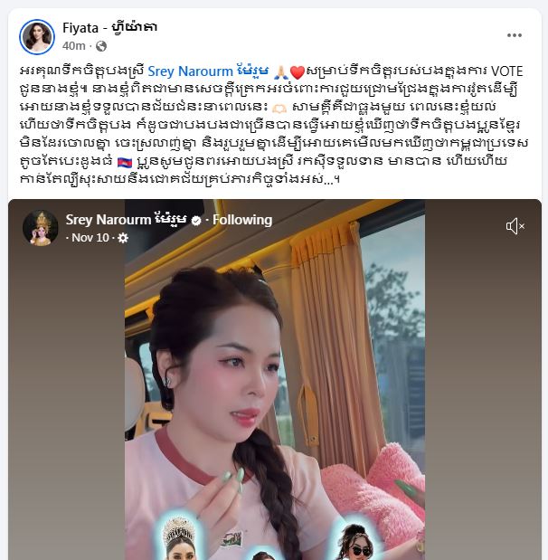 «នេះជាអ្វីដែលនាងខ្ញុំចង់ឃើញ ការរួបរួមគ្នា Support បវរកញ្ញាកម្ពុជា Fiyata – ហ្វីយ៉ាតា កំពុងតែឈរជើងលើឆាកអន្តរជាតិ បង្ហាញពីឥទ្ធិពល សម្រស់ Energy និង ភាពរឹងមាំរបស់នារីខ្មែរទៅលើឆាកអន្តរជាតិ សង្ឃឹមថាបងប្អូនខ្មែរទាំងអស់គ្នា ចូលរួម Support និង ឱ្យតម្លៃដល់បវរកញ្ញារបស់យើង»។