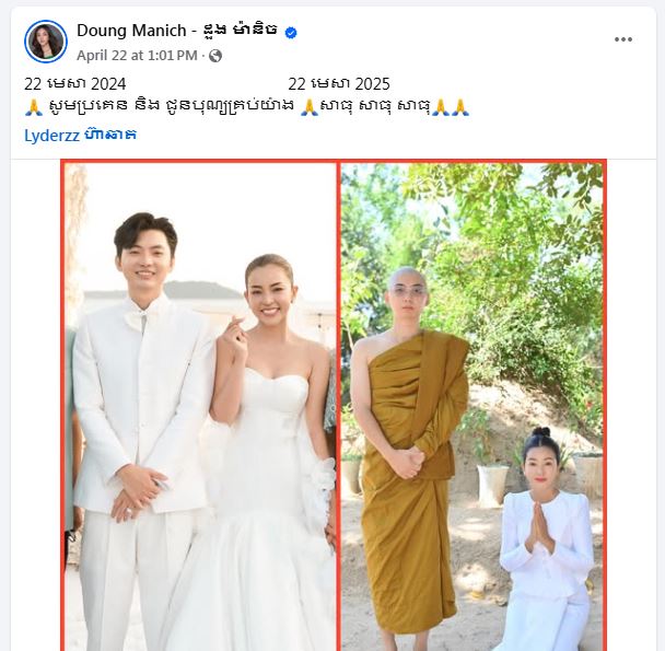 ដោយឡែក មកដល់ថ្មីៗនេះ ជាថ្ងៃគម្រប់ខួបអាពាហ៍ពិពាហ៍ ១ ឆ្នាំ របស់អ្នកនាង ដួង ម៉ានិច និង លោក Lyderzz ឃើញថាប្ដីប្រពន្ធមួយគូនេះ ក៏ពុំបានឃើញមានការរៀបចំអ្វីអបអរដូចគូស្វាមីភរិយាដទៃឡើយ ដោយអ្នកទាំងពីរបានបន្តធ្វើដំណើរសន្សំកុសលយ៉ាងជ្រះថ្លានៅក្រៅប្រទេស ខណៈលោក Lyderzz បានសាងផ្នួសម្ដងទៀត និង កំពុងធ្វើបុណ្យរក្សាសីលនៅឯប្រទេសស្រីលង្កា៕